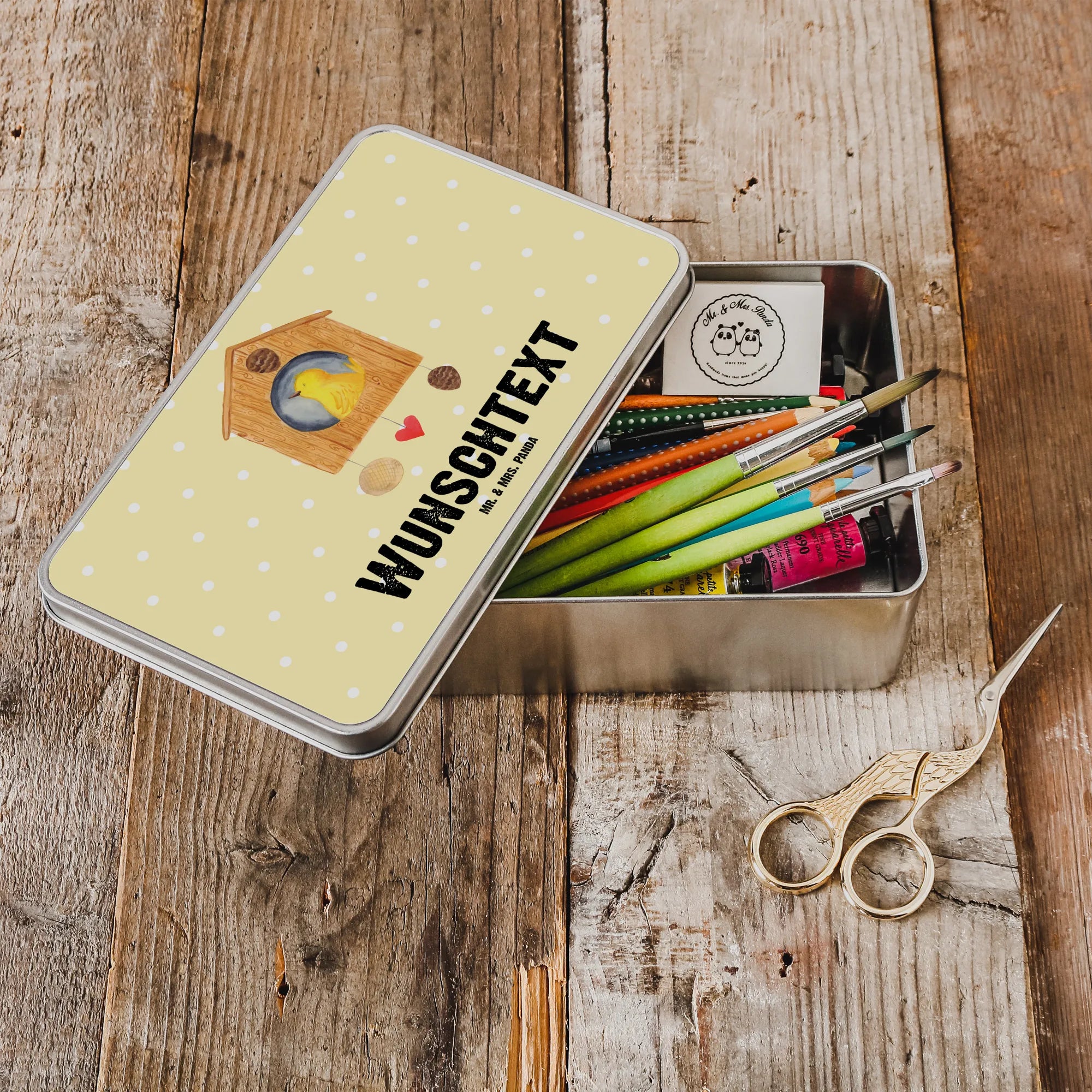 Hergestellt aus hochwertigem Metall, zeichnet sich die Metalldose durch ihr glänzendes Finish und ihre Stabilität aus. Sie misst 198 mm x 128 mm x 50 mm und hat ein Gewicht von 180 g, was sie robust, aber dennoch handlich macht. Jeder einzelne Artikel wird von Mr. & Mrs. Panda liebevoll gestaltet, sodass Du ein Stückchen von dieser magischen Tierwelt in Händen hältst. Der fröhliche gelbe Vogel, der in seinem gemütlichen Vogelhaus sitzt, versprüht die Liebe zur Natur und das Gefühl von Geborgenheit.