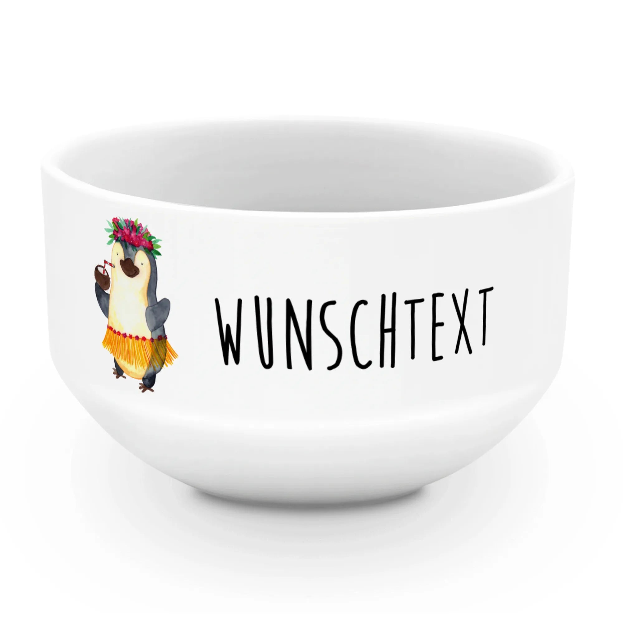 Der fröhliche Pinguin mit der Kokosnuss, der fröhlich in der Sonne tanzt, bringt jedem Frühstück ein Stück Urlaub ins Zuhause. Die Schale, gefertigt aus hochwertigem Porzellan, hat einen Durchmesser von 135 mm und ist mit einem brillanten Aufdruck versehen. So wird jede Müslischale zu einem Unikat, das Du mit Deinem Wunschtext oder Namen personalisieren kannst.