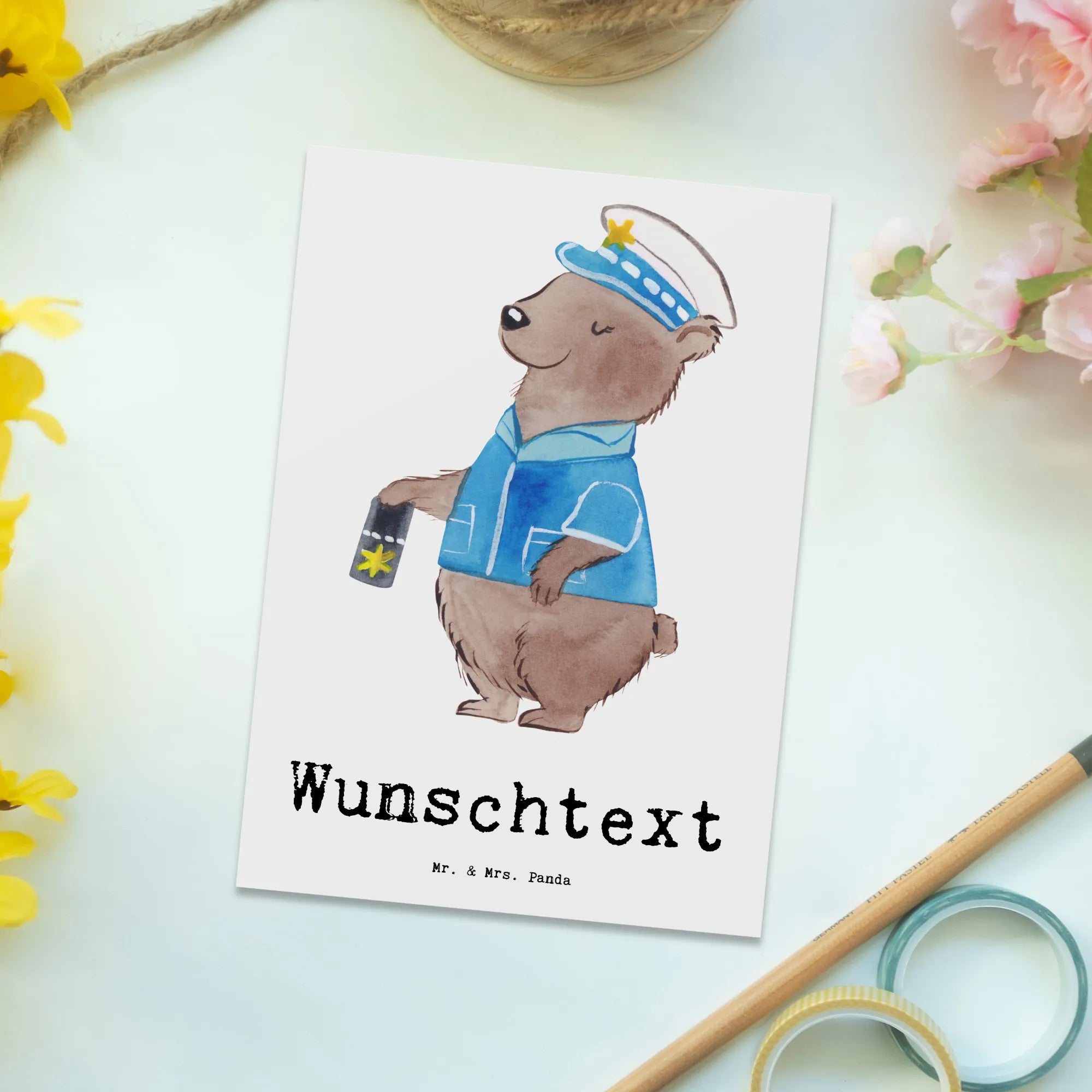 Wenn du also einen besonderen Polizeikollegen oder eine Kollegin hast, die du für ihren Einsatz und ihre Hingabe ehren möchtest, greif zu! Diese personalisierte Postkarte ist ein wunderbares Geschenk für jeden Anlass – sei es ein Geburtstag, eine Verabschiedung oder der Ruhestand. Du wirst sehen: Mit unserer Karte wird jedes Geschenk zu etwas ganz Besonderem und hinterlässt garantiert einen bleibenden Eindruck. Also, verkleinere nicht den Wert deiner Grüße – hol dir jetzt die perfekte Grußkarte von Mr. & Mrs. Panda und bringe ein Lächeln auf das Gesicht deiner Lieblingspolizistin!
