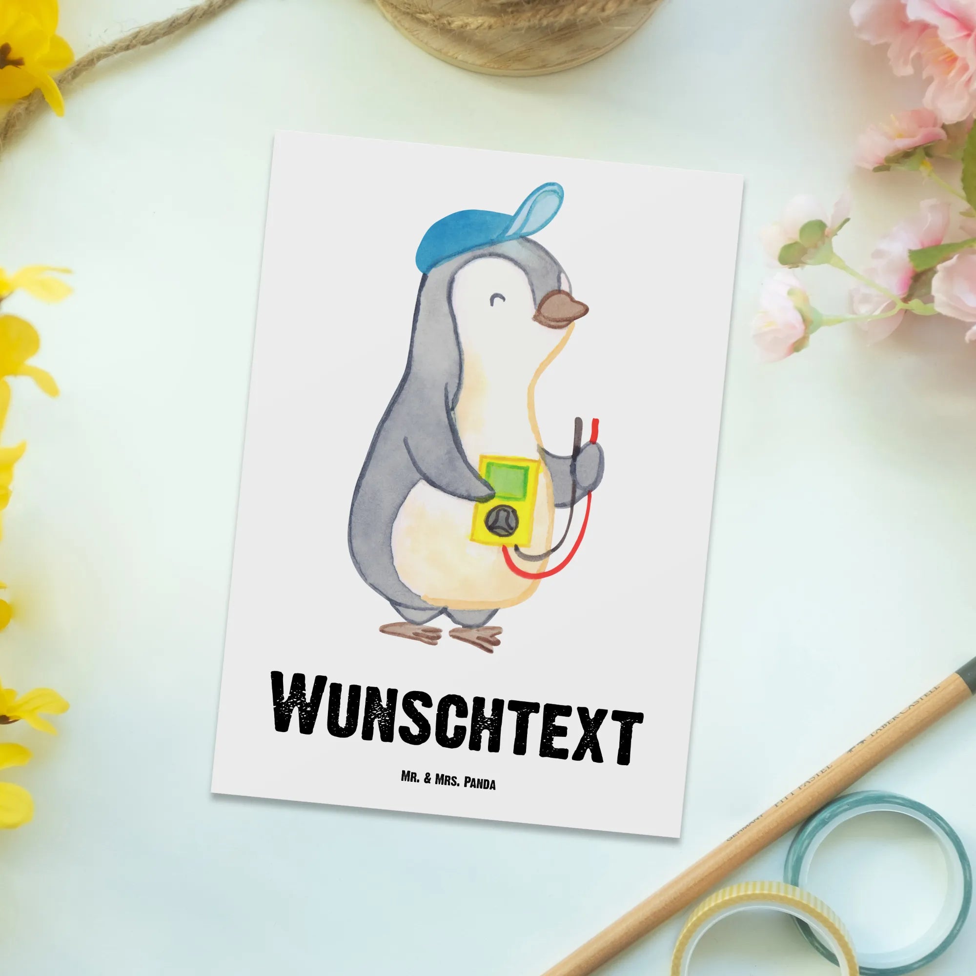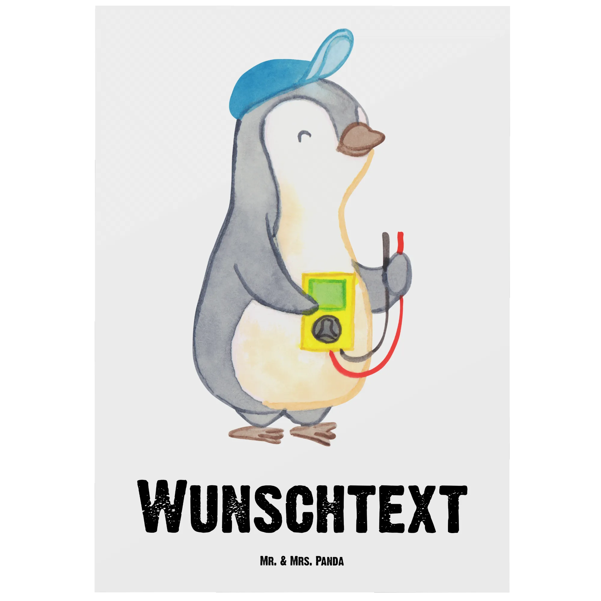 Beschenke einen ganz besonderen Menschen mit unserer personalisierten Postkarte "Elektriker mit Herz" aus der kreativen Berufe Kollektion von Mr. & Mrs. Panda! Diese einzigartige Postkarte ist perfekt für alle Elektriker, Elektronikmonteure, Elektrotechniker und Elektroinstallateure, die Tag für Tag mit hoher Spannung arbeiten und dafür viel Herzblut und Können in ihren Beruf stecken. Mit dem liebevoll designten Motiv eines kleinen Pinguins, der als Elektriker unterwegs ist, zaubert diese Karte garantiert ein Lächeln auf die Lippen.