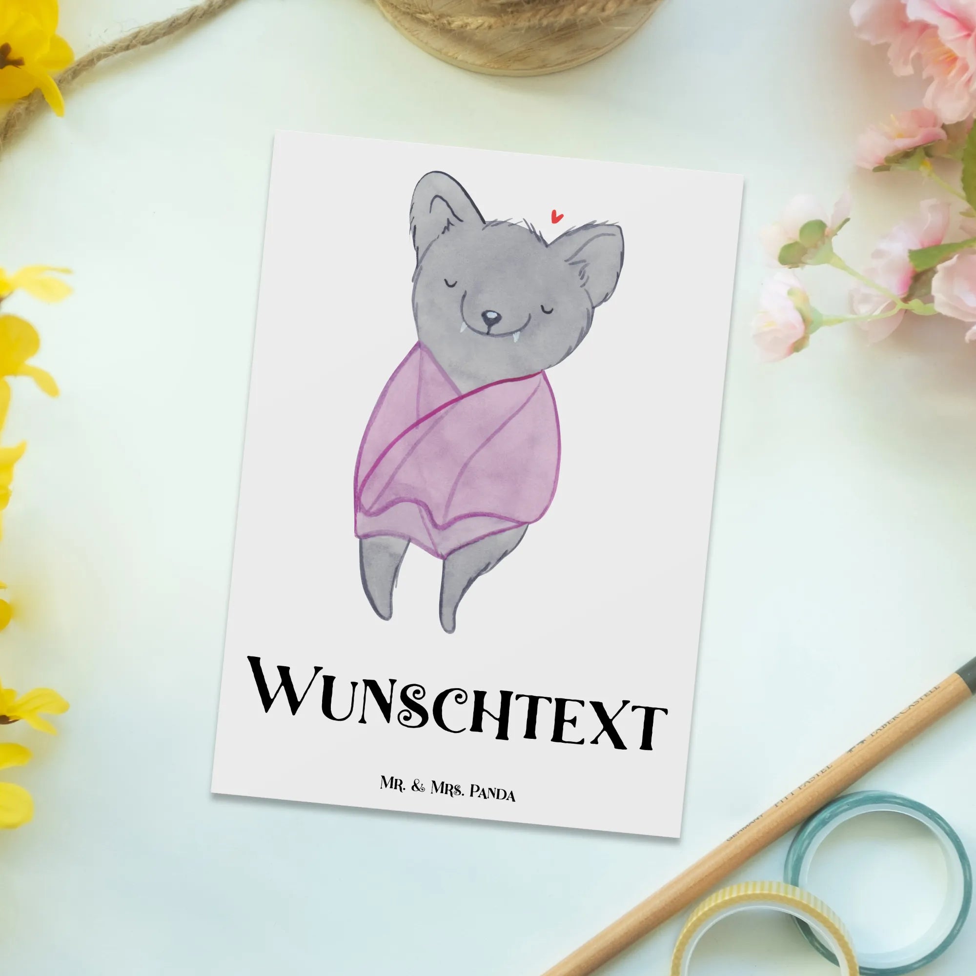 Die personalisierte Postkarte "Fledermaus Chillt" aus der Halloween Kollektion von Mr. & Mrs. Panda ist das perfekte Geschenk für alle, die sich an Halloween oder bei einem anderen Anlass über eine liebevolle Geste freuen möchten. Mit ihrem einzigartigen Design, das eine niedliche graue Fledermaus zeigt, die in einer rosa Decke eingewickelt ist und entspannt lächelt, bringt diese Postkarte Gemütlichkeit und Freude in jede Nachricht.