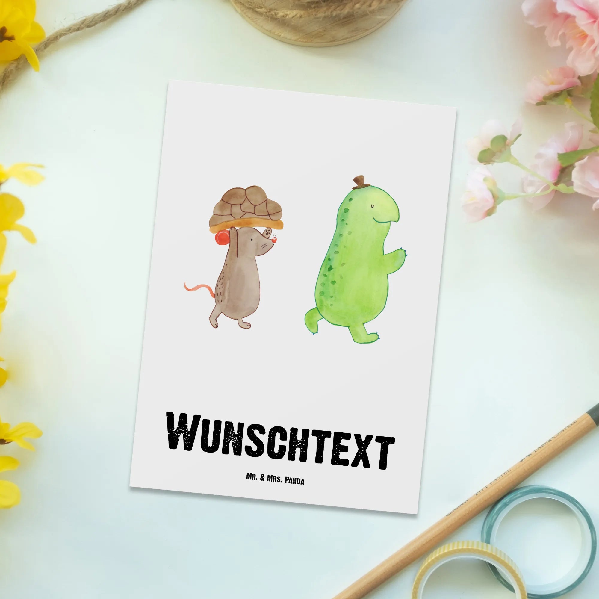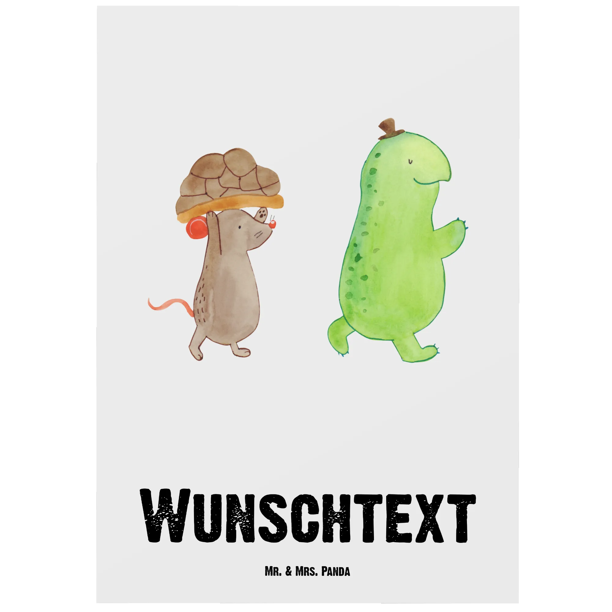 Wenn du nach einem kreativen und herzlichen Geschenk suchst, dann endet deine Suche hier! Lass die niedlichen Schildkröten und die fröhliche Maus für sich sprechen und verschenke Freude in Form einer personalisierten Postkarte von Mr. & Mrs. Panda!