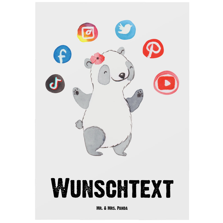 Egal, ob du einem Kollegen zum Jobbeginn, zur Beförderung, zum Jubiläum oder zum Abschied eine Freude machen möchtest, diese Karte ist das perfekte Geschenk! Hochwertig gefertigt aus 300 Gramm Karton, zeigt die Karte ein liebevolles Design mit einem süßen Panda, der fröhlich mit Social Media Icons jongliert.