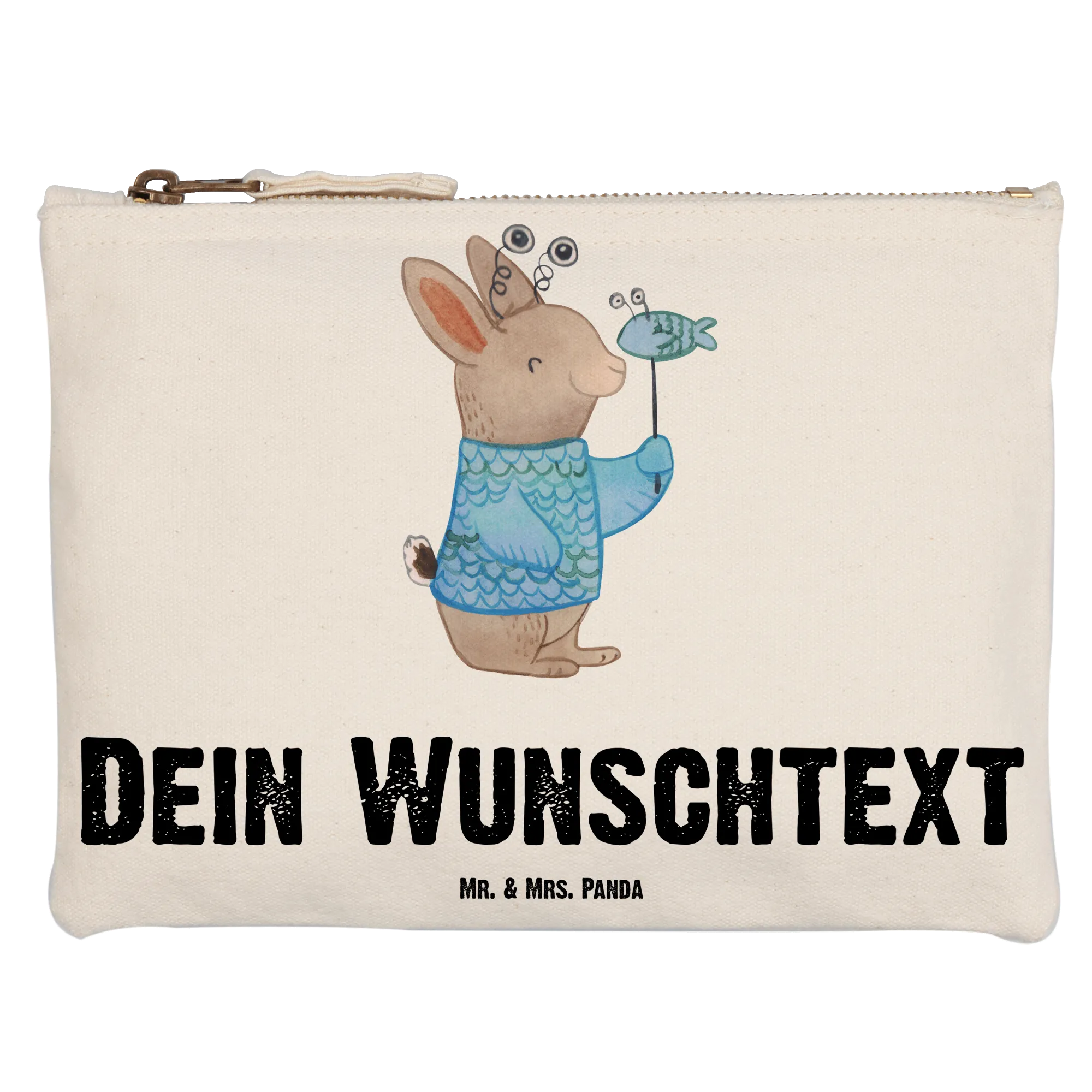 Diese wunderschöne, hochwertige Kosmetiktasche wird mit einem niedlichen Hase in Fischkostüm und dem Krafttier-Slogan „Fische-Power: Tief wie der Ozean, frei wie der Fluss“ liebevoll bedruckt.