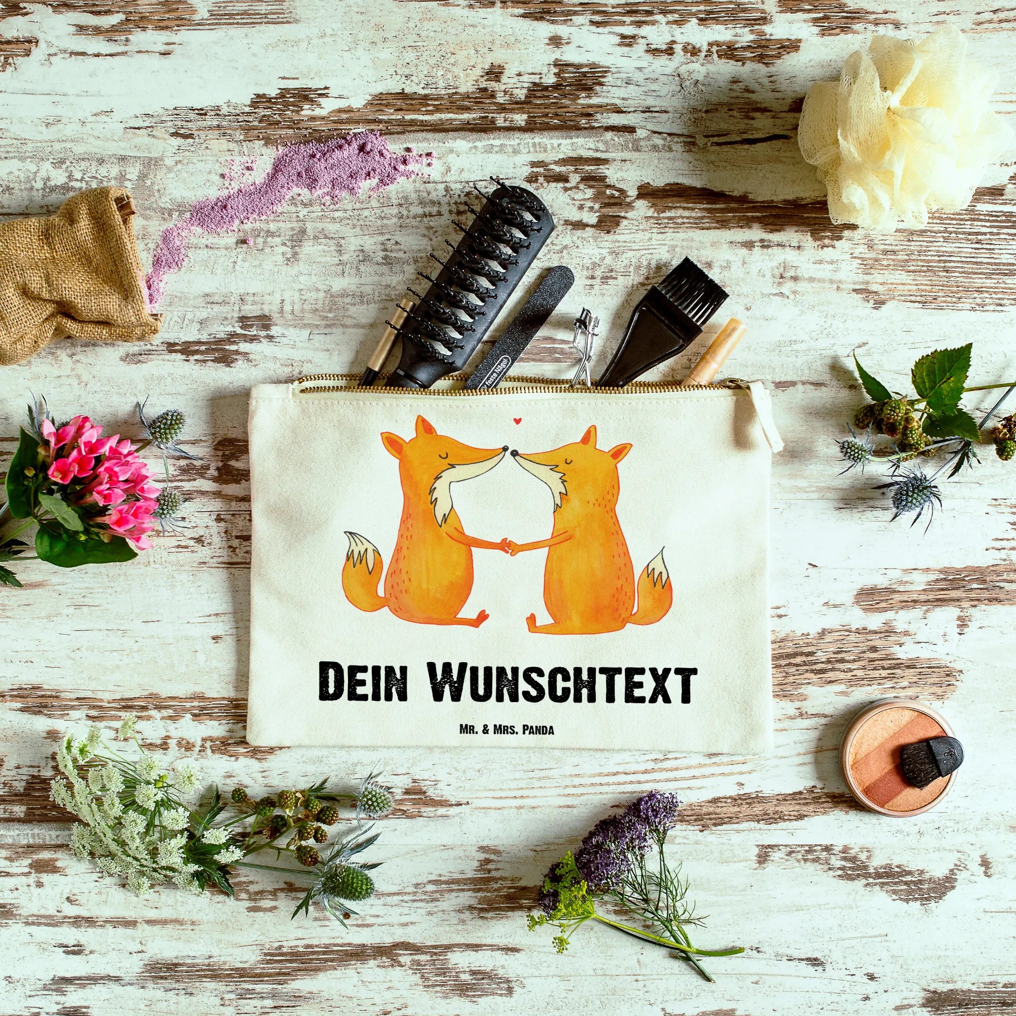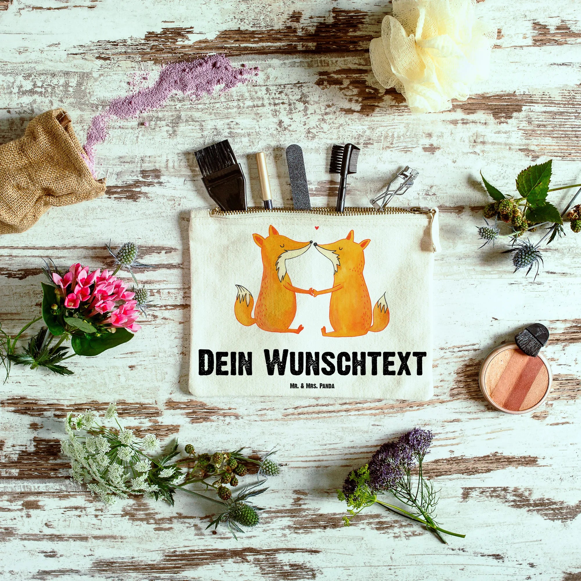 Entdecke die zauberhafte personalisierte Schminktasche mit dem liebevollen Füchse Liebe Motiv von Mr. & Mrs. Panda! Diese einzigartige Kosmetiktasche ist nicht nur wunderschön gestaltet, sondern auch perfekt für alle, die ihre Schönheit unterwegs stilvoll aufbewahren möchten.