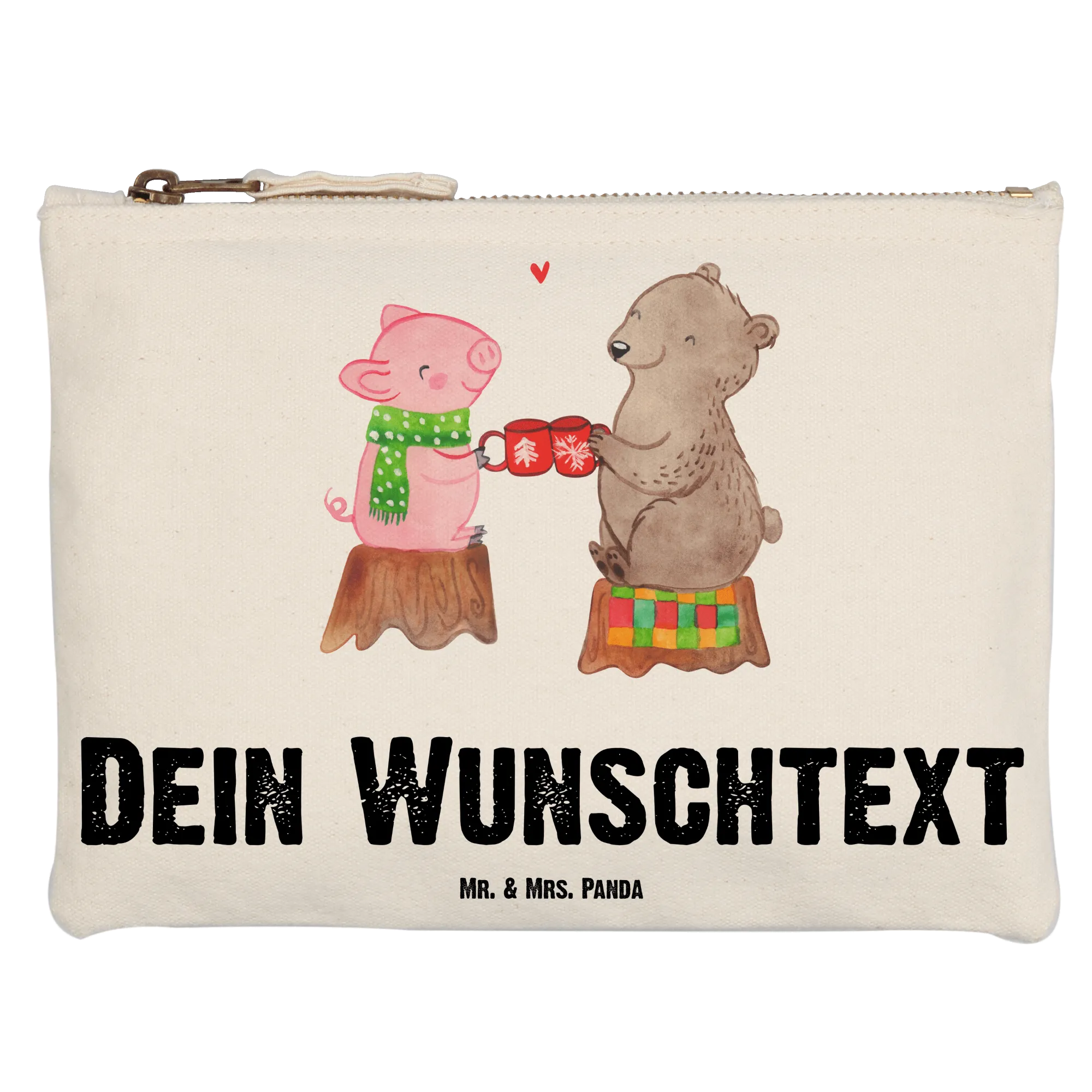 Die personalisierte Schminktasche "Glühschwein Sause" aus der Winter Kollektion von Mr. & Mrs. Panda ist das perfekte Geschenk für alle, die die besinnliche Weihnachtszeit lieben! Diese wunderschöne Schminktasche ist nicht nur ein praktischer Begleiter für deine Kosmetikartikel, sondern auch ein liebevolles Statement, das Freude und Wärme verbreitet. Das niedliche Motiv zeigt ein kleiner Bär und ein Schweinchen, die mit einer Tasse anstoßen und sich gegenseitig "Prost" und "Alles Gute" wünschen. Ein kleines Herzchen verbindet die beiden und macht das Design besonders charmant.