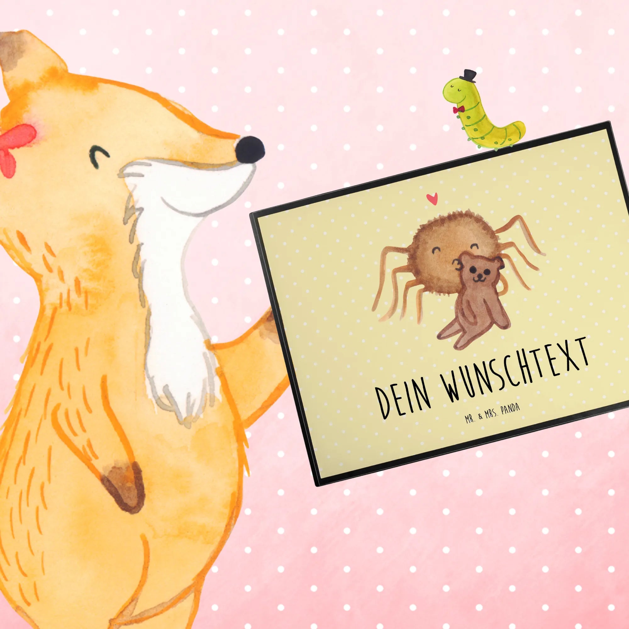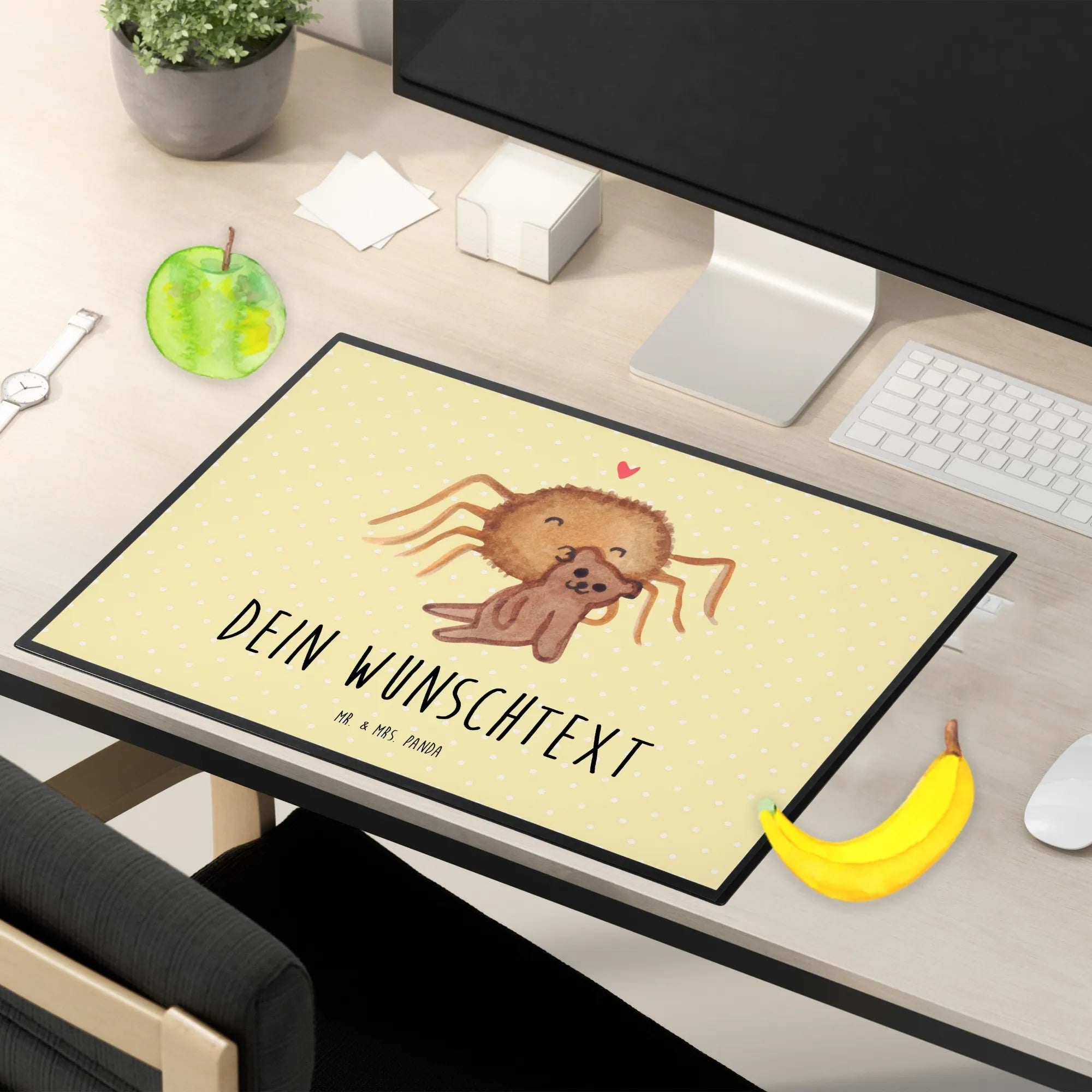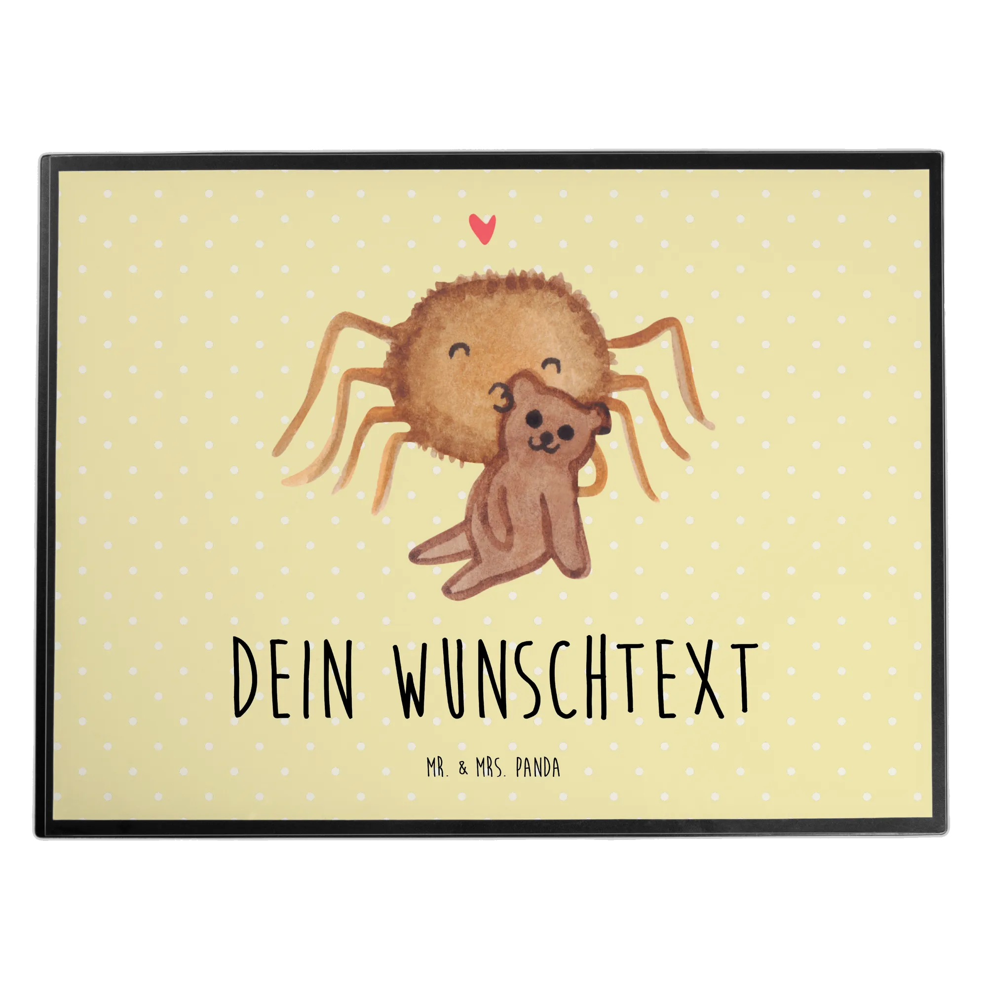 Ob für einen lieben Freund oder als süßes Liebesgeschenk an eine ganz besondere Person — die personalisierte Schreibtischunterlage "Spinne Agathe Teddy" aus der beliebten Kollektion von Mr. & Mrs. Panda ist die beste Wahl. Lass dich von der liebevollen Gestaltung und den fröhlichen Farben bezaubern und bringe ein Stückchen Heimat und Herz in dein Büro oder in dein Zuhause. Jeder wird sich über dieses liebevolle Geschenk freuen, und dein Schreibtisch wird zum Blickfang für alle!