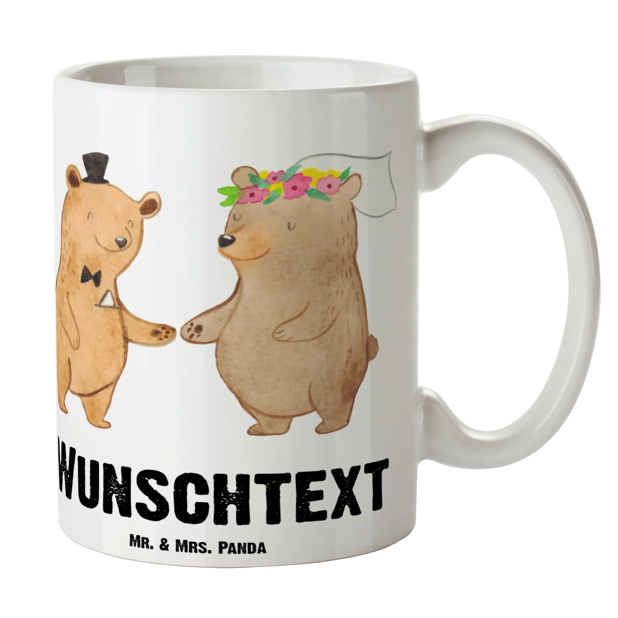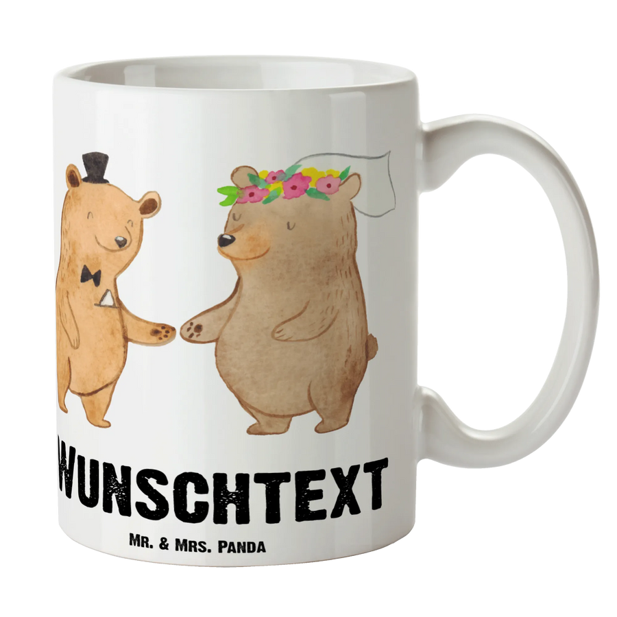 Die personalisierte Tasse "Bären Heirat" von Mr. & Mrs. Panda ist das perfekte Geschenk zur Hochzeit für frisch vermählte Paare oder auch als Hochzeitsgeschenk für eine Trauung. Diese wunderschöne Keramiktasse ist nicht nur praktisch, sondern auch äußerst liebevoll gestaltet. Das zauberhafte Motiv zeigt ein Brautpaar aus zwei niedlichen Bären, die sich an den Pfoten halten und sich tief in die Augen blicken. Der Bräutigam trägt einen eleganten Hut, ein Einstecktuch und eine Fliege, während die Braut mit einem Zauber aus einem Blumenkranz und einem üppigen Schleier bezaubert. Das Aquarell-Design verleiht der Tasse eine besondere Wärme und strahlt Liebe aus.