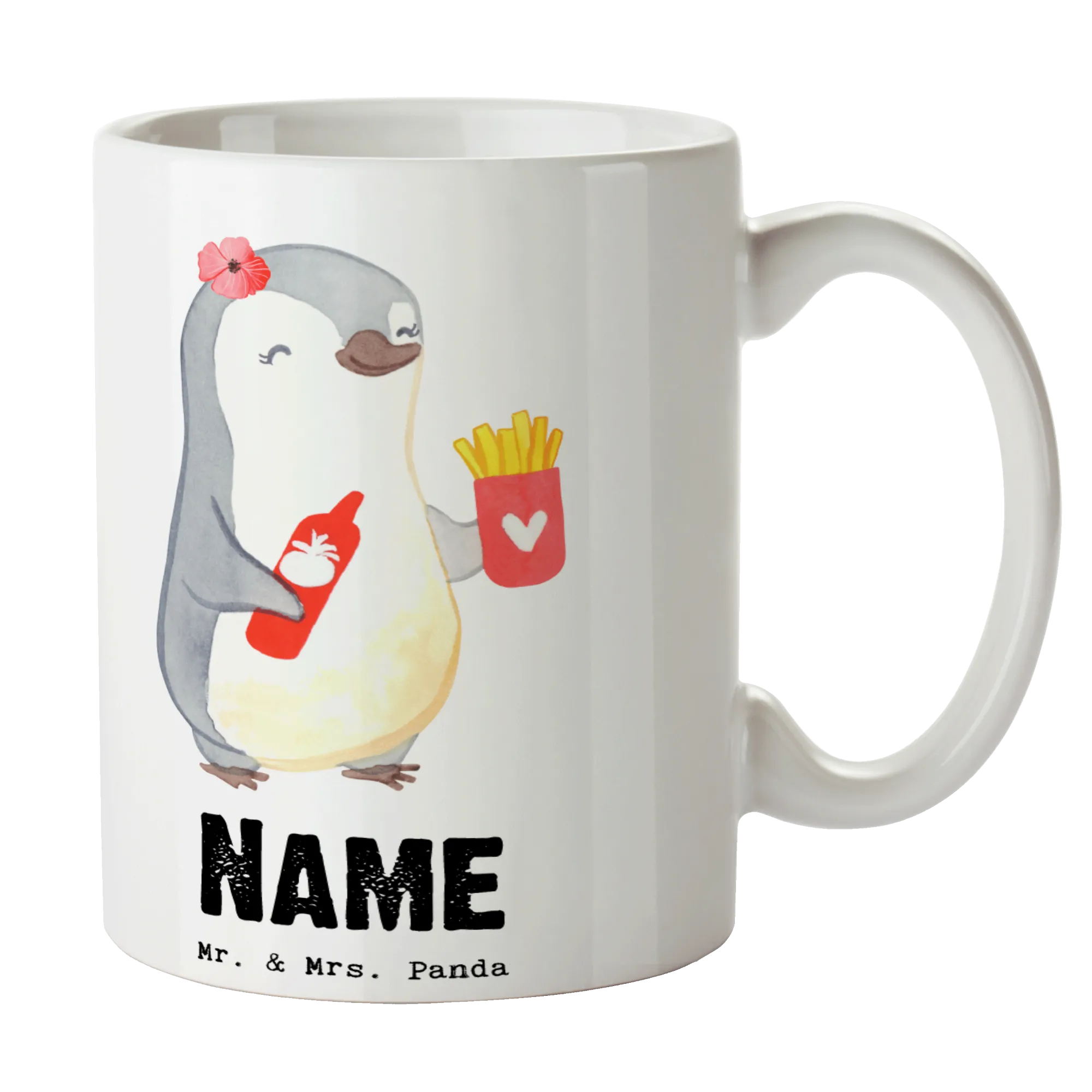 Die personalisierte Tasse 'Imbissbesitzerin mit Herz' von Mr. & Mrs. Panda ist das perfekte Geschenk für alle, die in der Gastronomie arbeiten oder einfach nur eine Leidenschaft für leckere Snacks und Pommes haben. Diese wunderschöne, spülmaschinenfeste Keramiktasse ist nicht nur praktisch, sondern auch ein echter Hingucker! Du kannst die Tasse mit dem Namen deiner Wahl personalisieren und so ein einzigartiges Geschenk kreieren, das von Herzen kommt.