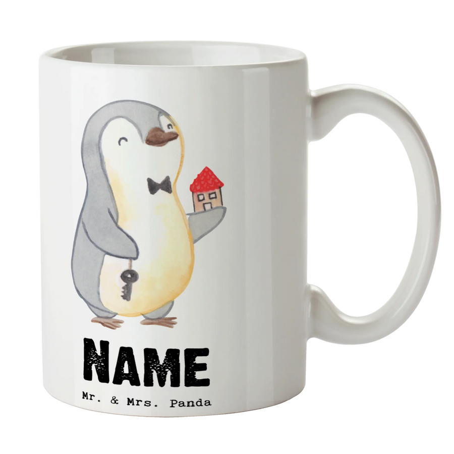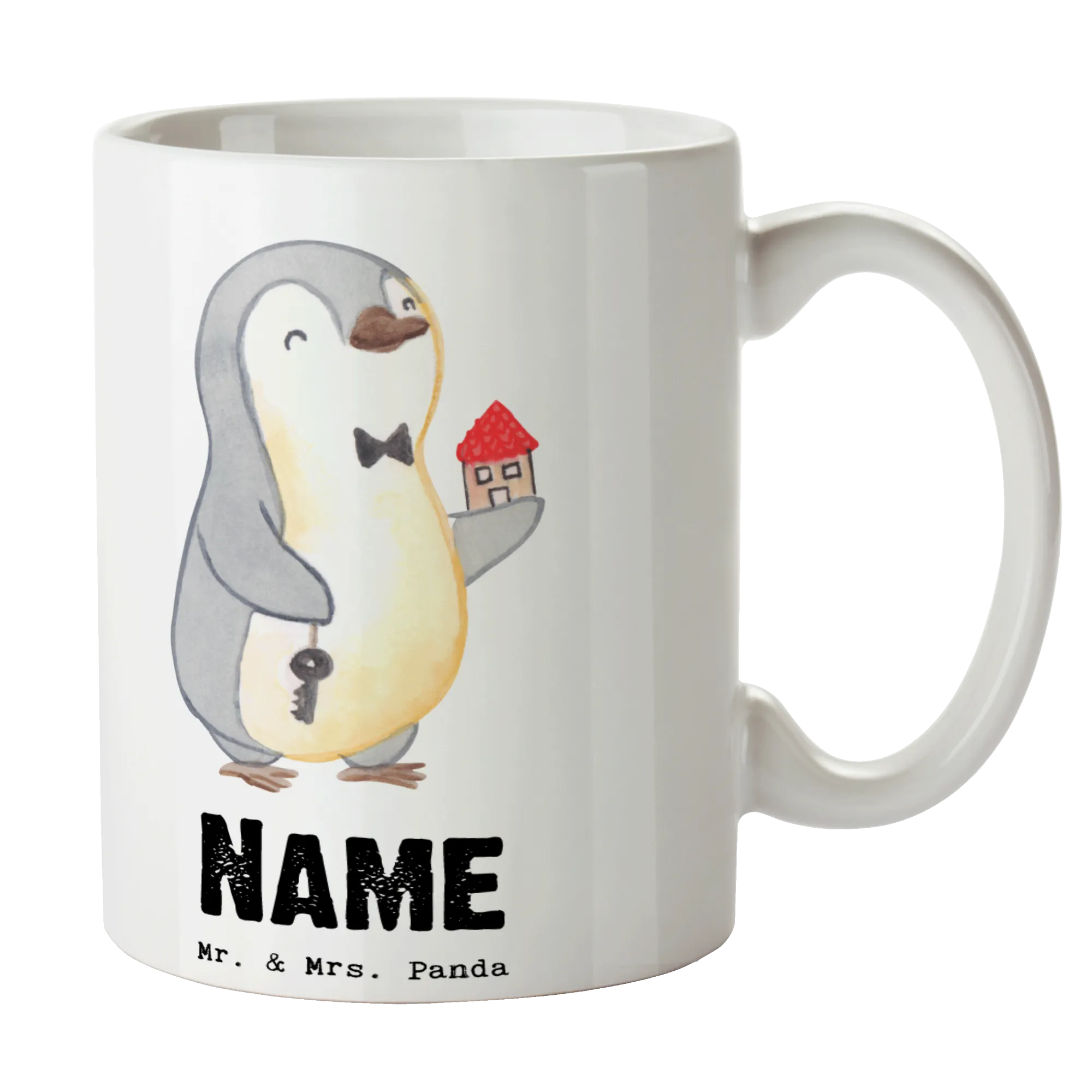 Die personalisierte Tasse "Immobilienkaufmann mit Herz" von Mr. & Mrs. Panda ist das perfekte Geschenk für alle, die mit Leidenschaft im Immobiliengeschäft tätig sind. Mit einem liebevoll gestalteten Motiv, das einen niedlichen Pinguin zeigt, der einen Schlüssel in der einen Hand und ein Haus in der anderen hält, wird diese Tasse zum Hingucker in jedem Büro.