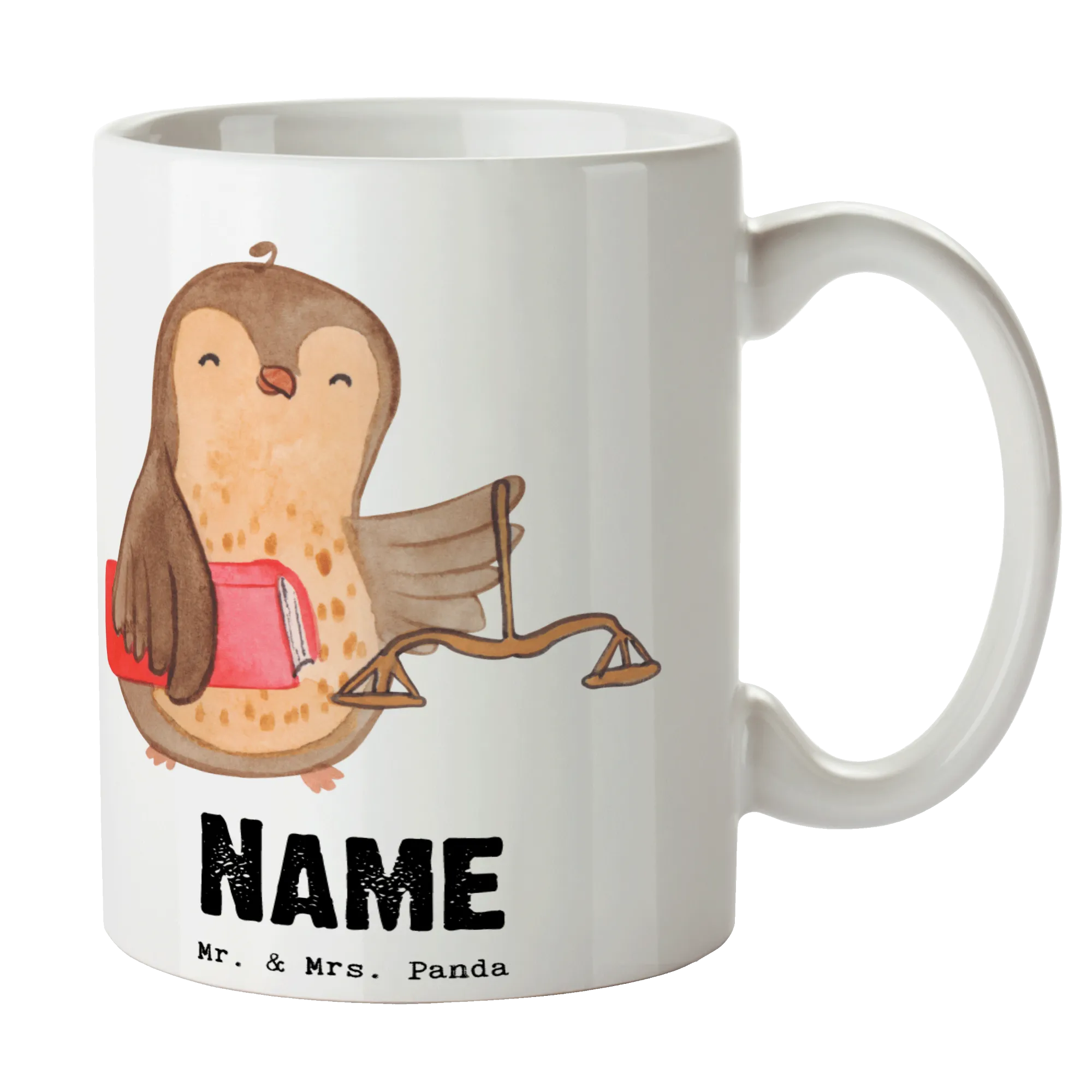 Entdecke die perfekte Geschenkidee für Juristen – die personalisierte Tasse 'Jurist mit Herz' von Mr. & Mrs. Panda! Diese wunderschöne, spülmaschinenfeste Keramiktasse ist nicht nur ein hübsches Accessoire, sondern hat auch einen ganz besonderen Slogan: 'Du bist nur ein halber Mensch, wenn du kein Jurist bist.' Mit einem süßen, handgezeichneten Motiv einer Eule, die ein Gesetzbuch in den Flügeln hält, wird sie das Herz jedes Jurastudenten höher schlagen lassen.