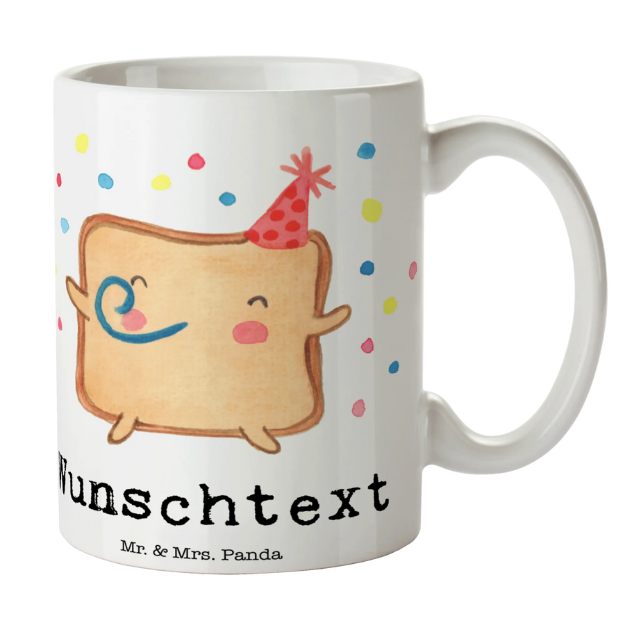 Die Tasse wird mit deinem Wunschnamen personalisiert und hat das liebevolle Motiv eines lächelnden Toastes, der festlich mit einem Partyhut geschmückt ist. Um ihn herum sind bunte Konfetti-Punkte verteilt, die die fröhliche Stimmung perfekt unterstreichen. Die Tasse hat eine Füllmenge von 300 ml und ist aus hochwertiger Keramik gefertigt, die sowohl mikrowellen- als auch spülmaschinengeeignet ist. So kannst du deine Tasse immer wieder verwenden, ohne dir Sorgen um das Design machen zu müssen - sie hält bis zu 2000 Waschgänge in der Spülmaschine aus!