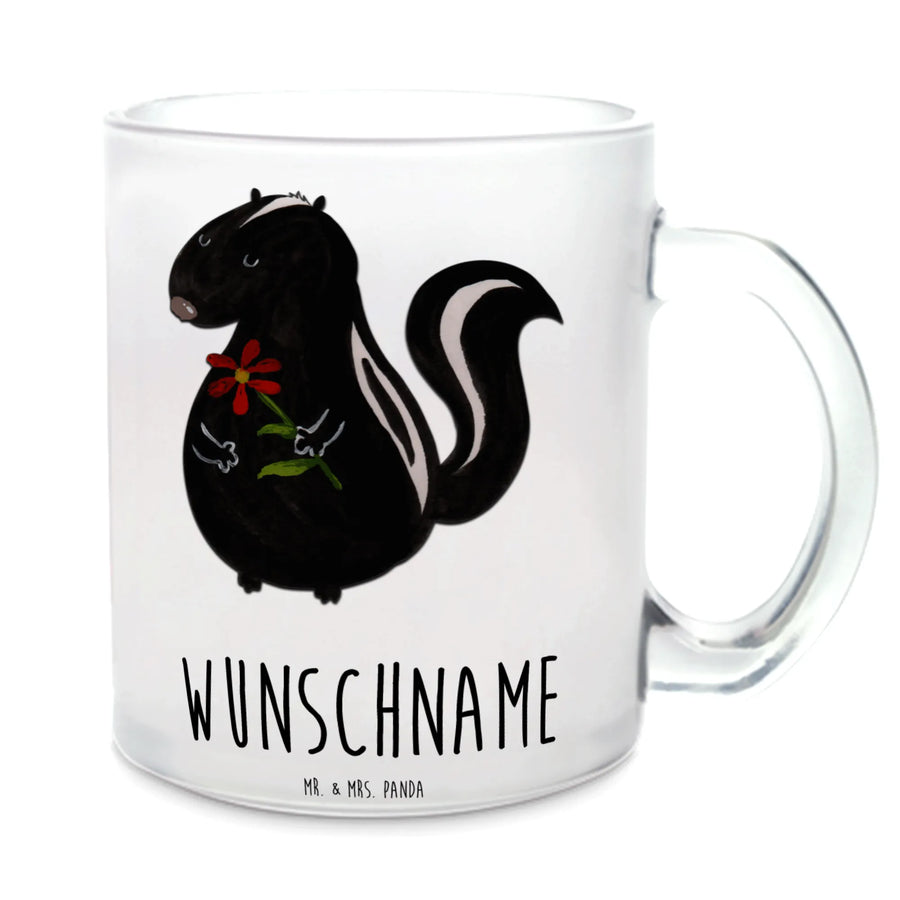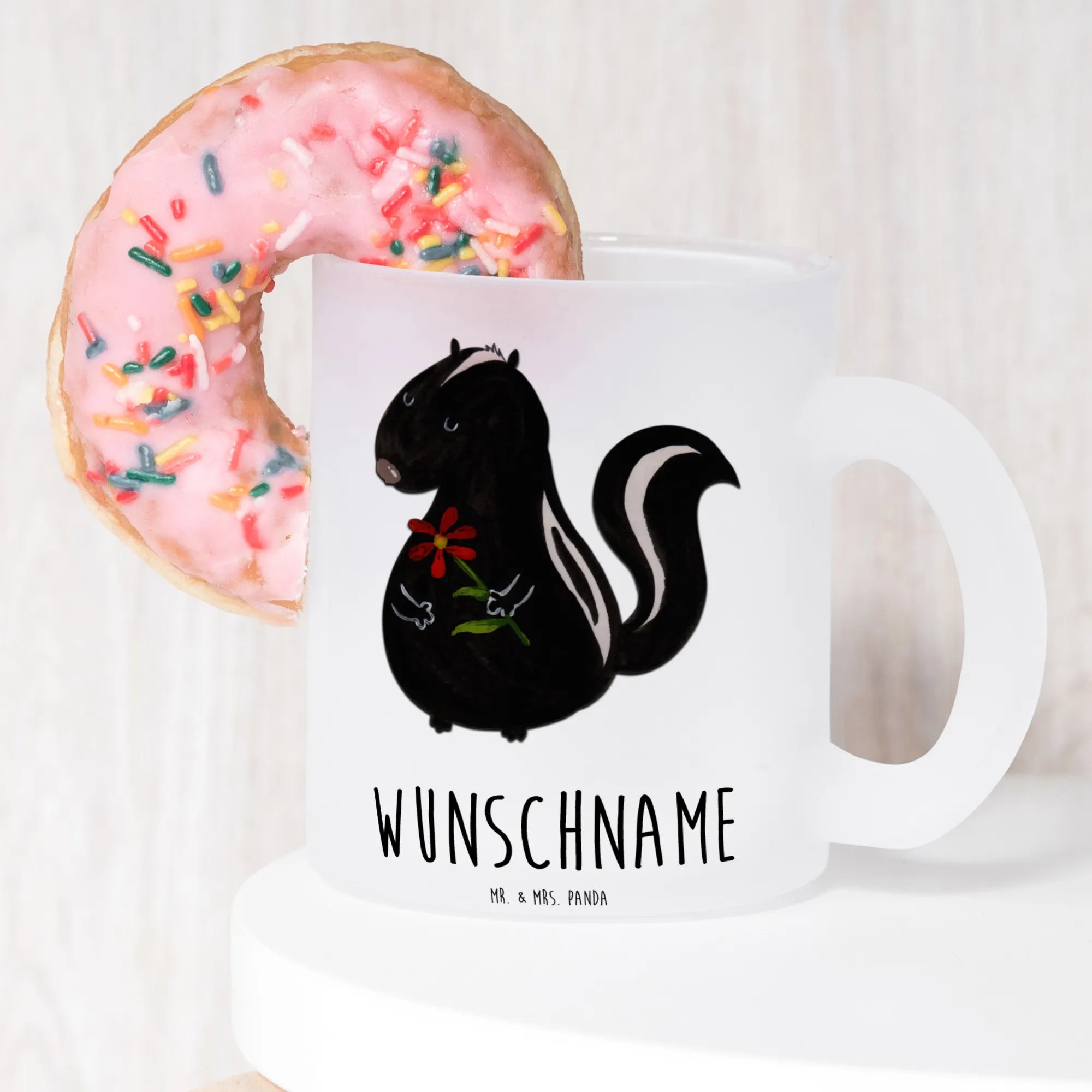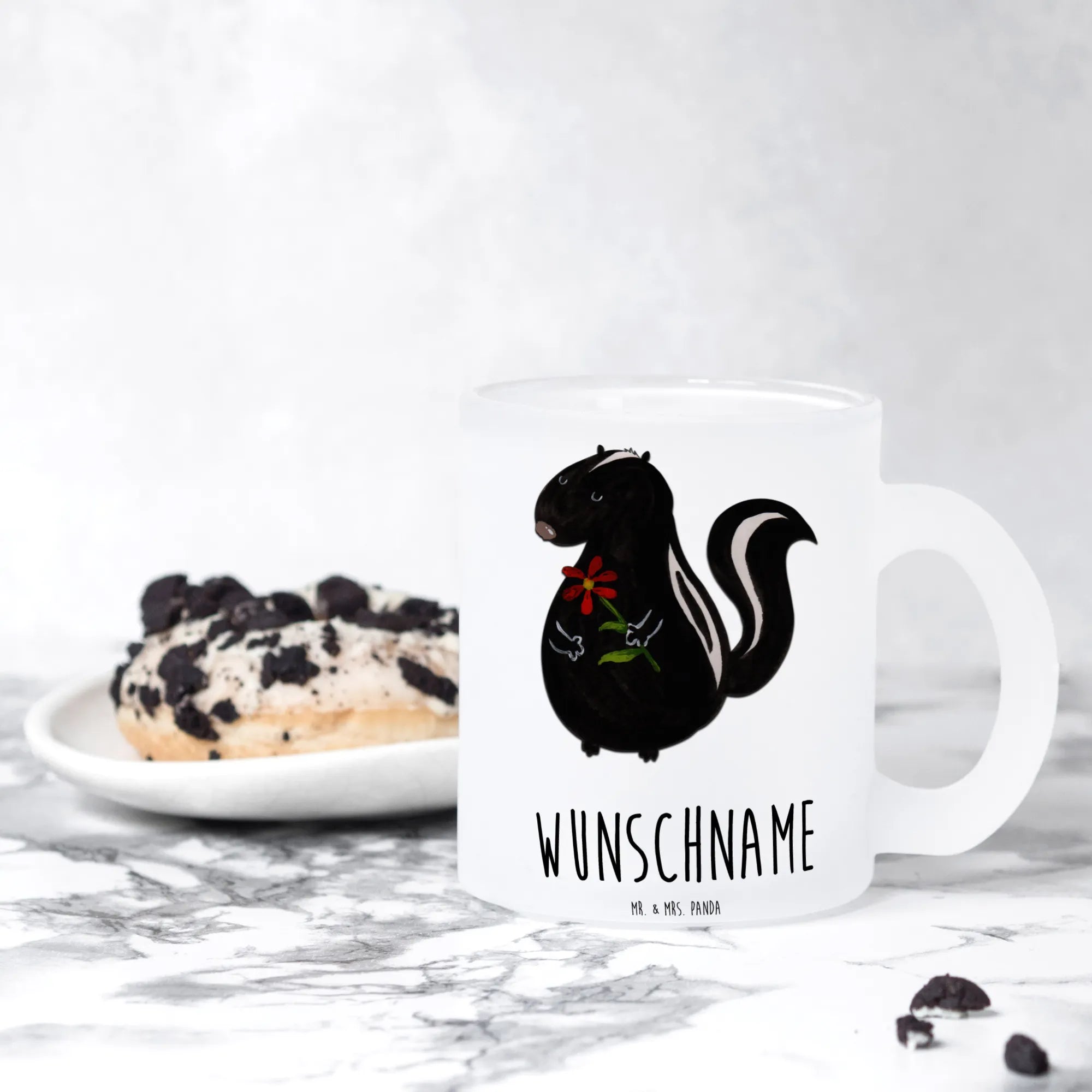 Entdecke die zauberhafte, personalisierte Teetasse "Stinktier Blume" aus der exklusiven Stinktier-Kollektion von Mr. & Mrs. Panda!