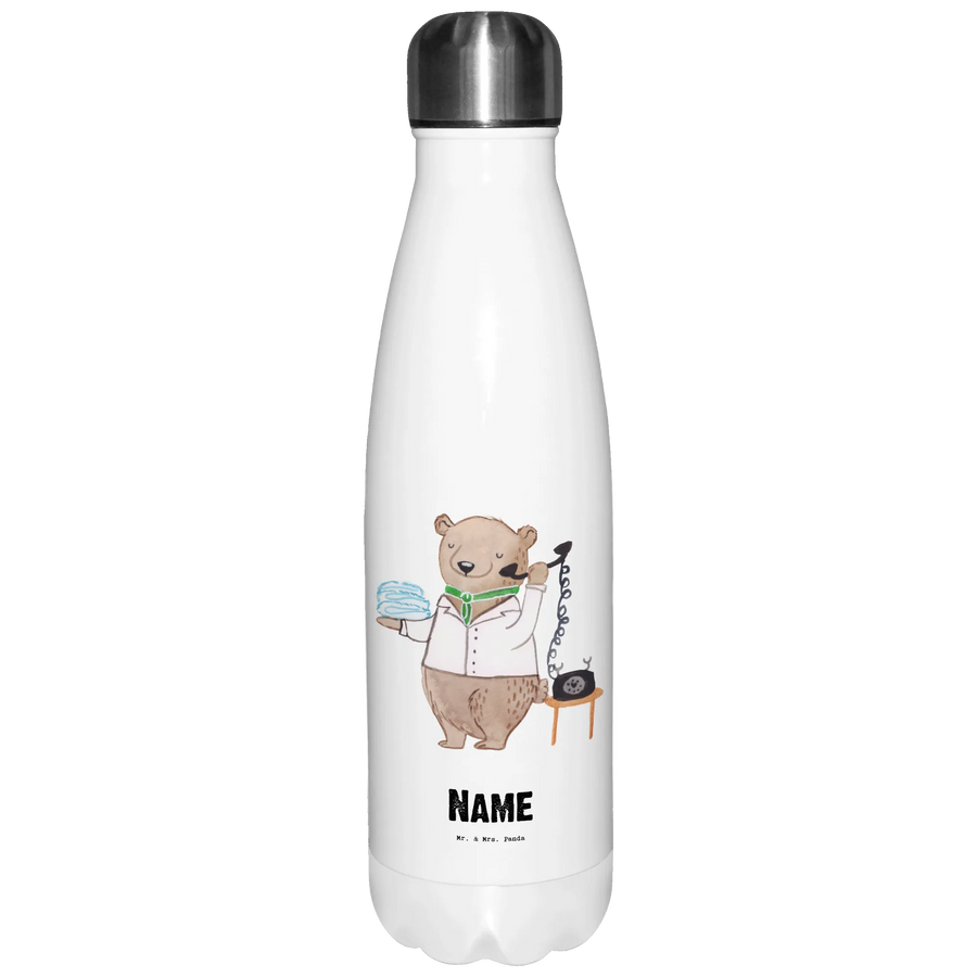 Der niedliche Bär mit einem Telefon in der Hand und frischen Handtüchern in der anderen Hand bringt ein Lächeln in den Alltag einer Hotelkauffrau. Mit einem Füllvolumen von 500 ml bietet diese Flasche genug Platz für deinen Lieblingskaffee oder Tee, ganz gleich, ob im Büro, beim Kundenbesuch oder unterwegs.