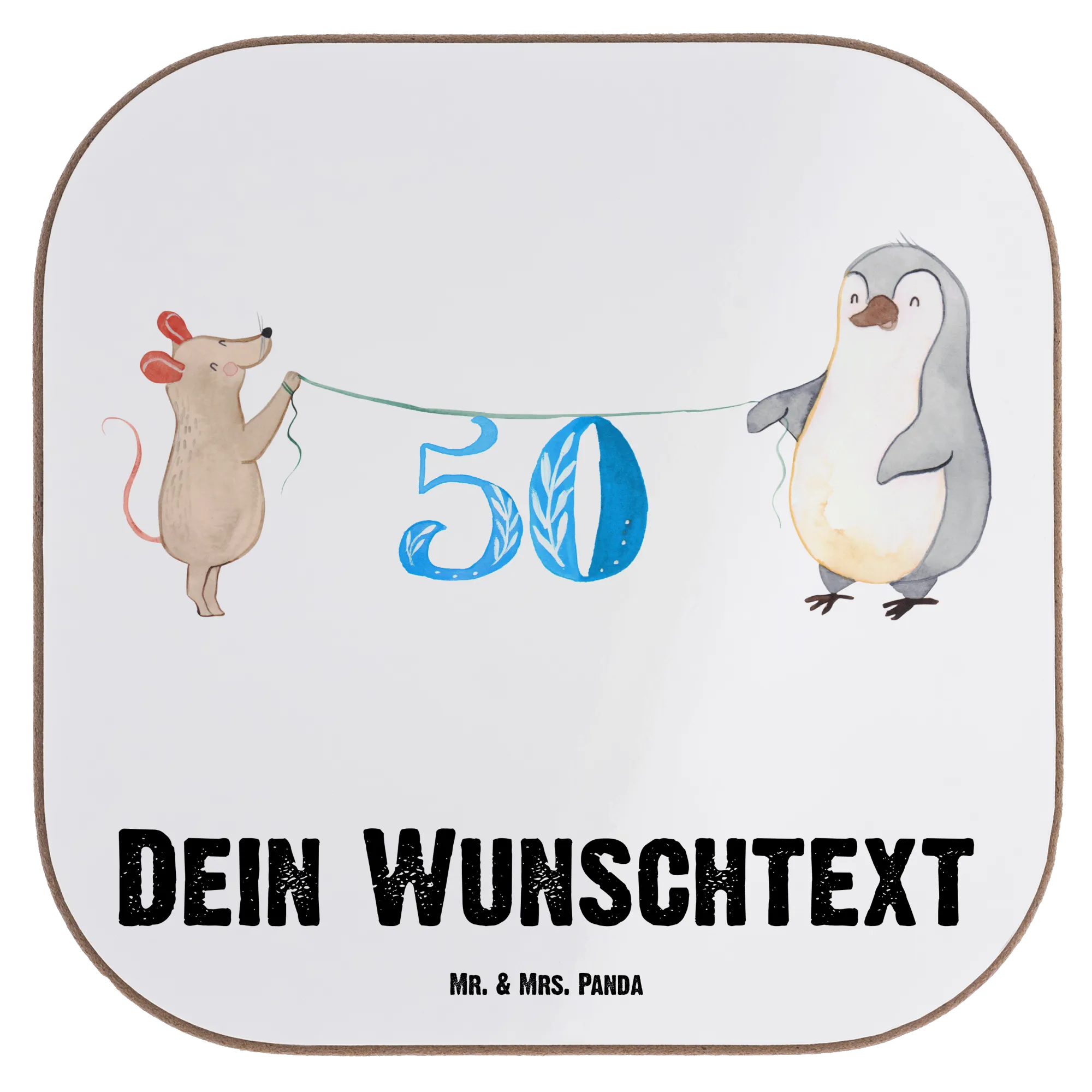 Der personalisierte Untersetzer zum 50. Geburtstag mit dem entzückenden Motiv von einer Maus und einem Pinguin ist das perfekte Geschenk für deine Freunde und Familie! Dieser hübsche quadratische Untersetzer wurde speziell für Jubiläumsfeiern entworfen und bietet nicht nur ein fröhliches Design, sondern auch richtig viel Herz. Der süße Pinguin und die kleine Maus halten eine Girlande und feiern gemeinsam den 50. Geburtstag! ♡ Die Botschaft "Zum 50. Geburtstag wünsche ich dir Sonnenschein an grauen Tagen, Lachfältchen, die dich noch zauberhafter machen und eine Keksdose, die nie leer geht." macht dieses Geschenk noch spezieller!