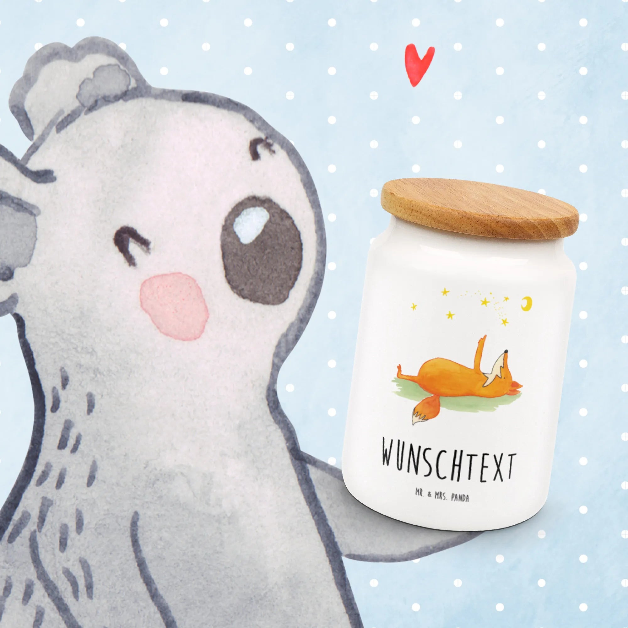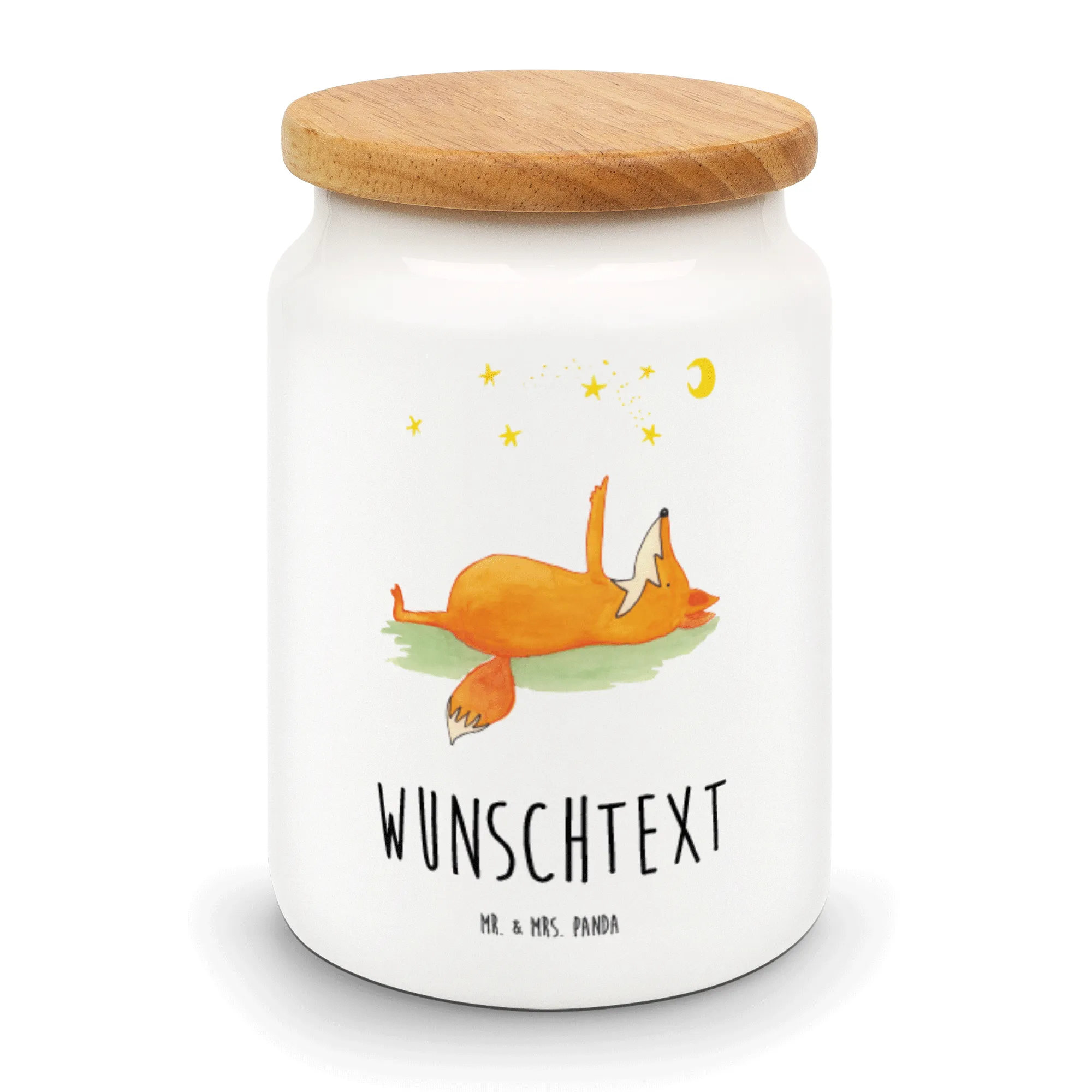 Entdecke die bezaubernde, personalisierte Vorratsdose Fuchs Sterne von Mr. & Mrs. Panda! Diese hochwertige Keramikdose ist nicht nur schön, sondern auch funktional und perfekt für alle, die das Besondere lieben. Mit ihrem liebevoll gestalteten Motiv des süßen Fuchses, der friedlich auf dem Rücken liegt und zu den Sternen schaut, wird diese Dose zu einem echten Blickfang in deiner Küche oder deinem Zuhause.