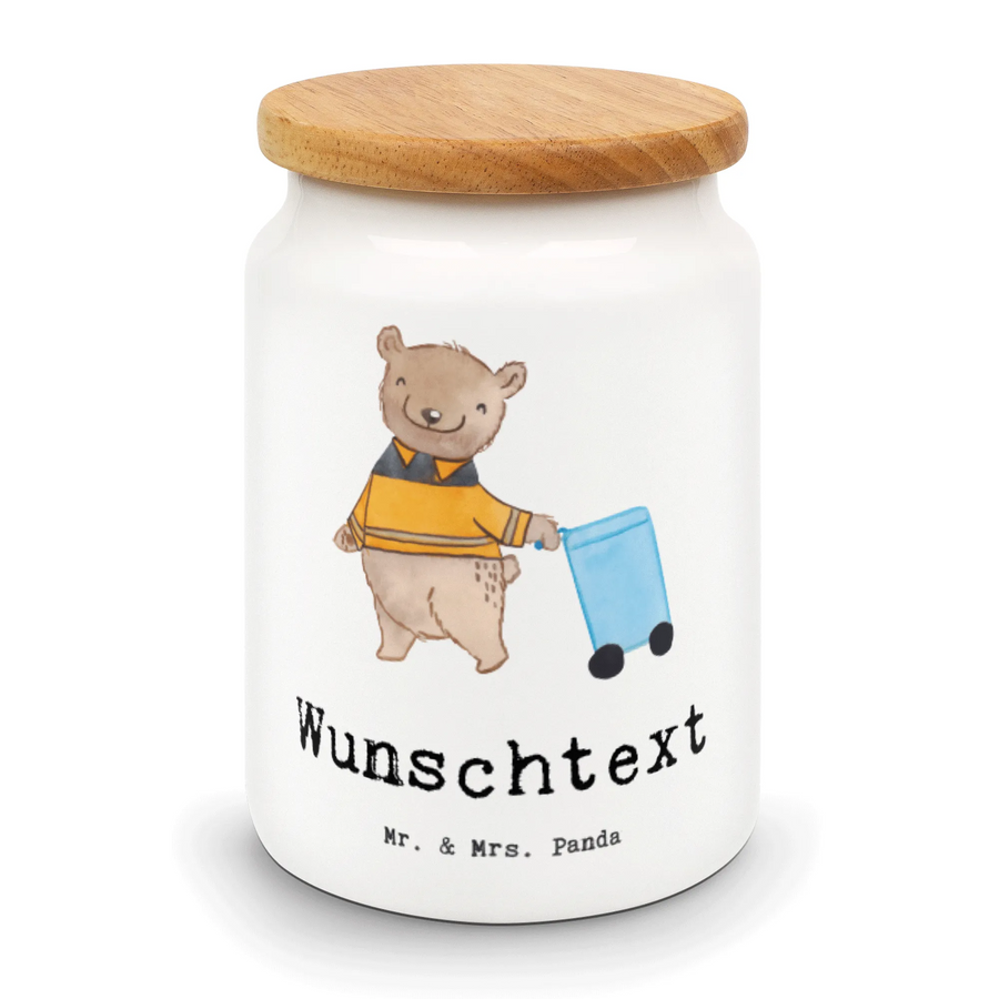 Die personalisierte Vorratsdose "Müllwerker mit Herz" von Mr. & Mrs. Panda ist das perfekte Geschenk für jeden, der die wichtige Arbeit im Bereich der Abfallwirtschaft wertschätzt. Diese liebevoll gestaltete Keramikdose bringt nicht nur Farbe in jede Küche, sondern feiert auch den unermüdlichen Einsatz der Müllwerker.