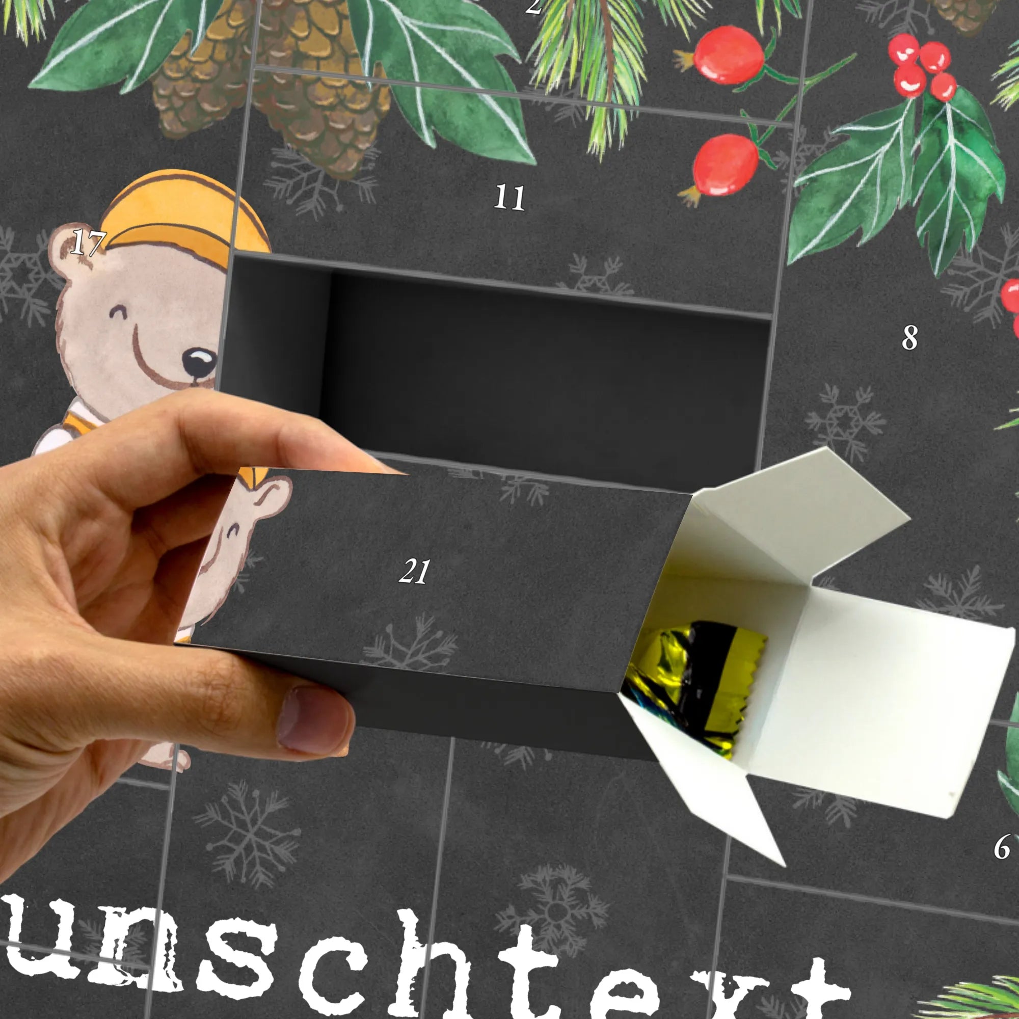 Der Kalender wird ohne Füllung geliefert, sodass Du die Freiheit hast, ihn nach Deinen Vorstellungen zu gestalten. Ob für den Berufsabschied, das Jubiläum oder einfach als Dankeschön: dieser Adventskalender sorgt für ein strahlendes Lächeln und bringt gute Laune ins Lager.