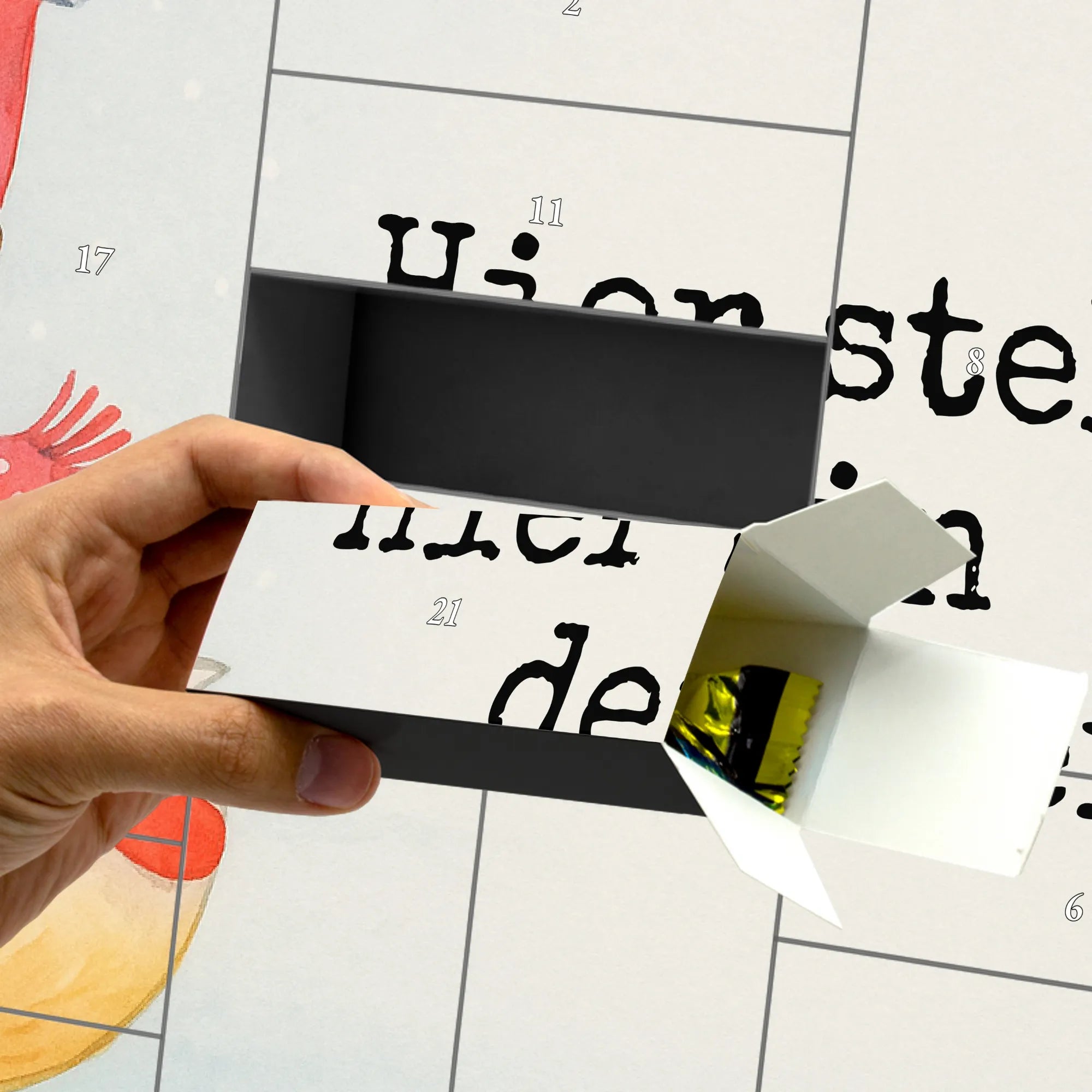 Adventskalender mit Namen – personalisiert und wunderbar gestaltet von Mr. & Mrs. Panda. Dieser Kalender ist ideal, wenn du jemandem eine ganz persönliche Freude machen willst: Wir bedrucken ihn mit deinem Wunschnamen oder Wunschtext und verzieren die Vorderseite mit einer liebenswerten Illustration von Mrs. Panda. Der robuste Adventskalender Karton sorgt für Stabilität, die seidenmatte Oberfläche und die brillante Druckqualität für ein edles Erscheinungsbild. Er enthält 24 Schachteln zum Selbstbefüllen, perfekt für kleine Geschenke, Notizen oder Süßes. Die integrierte Aufstellvorrichtung macht das Dekorieren ganz einfach. Bitte beachte: wird ohne Füllung geliefert. Maße: Breite: 619 mm, Höhe: 405 mm, Tiefe: 50 mm. Ein persönliches Geschenk mit viel Herz – genau im Mr. & Mrs. Panda Stil.