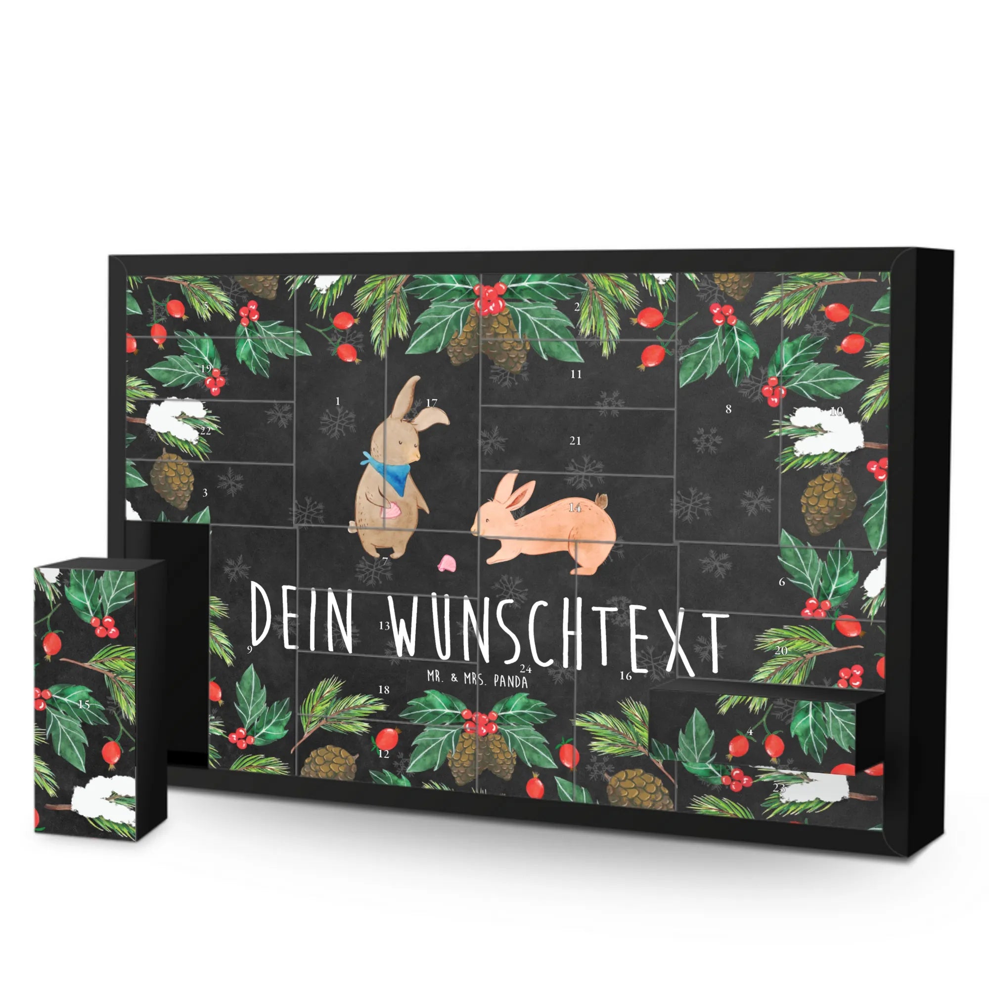 Personalisierter Befüllbarer Adventskalender von Mr. & Mrs. Panda – dein perfekter Begleiter durch die Vorweihnachtszeit! Dieser liebevoll gestaltete Adventskalender ist bedruckt mit wunderschönen Sprüchen und Motiven von Mr. & Mrs. Panda und lässt sich ganz nach deinem Geschmack personalisieren: Trage deinen Wunschnamen oder Wunschtext ein, und wir drucken ihn auf die Vorderseite. Auf der Frontseite findest du eine zauberhafte Zeichnung von Mrs. Panda, die dem Kalender einen warmen, persönlichen Touch verleiht. Der Kalender verfügt über 24 praktische Schachteln zum Selbstbefüllen, ideal für kleine Überraschungen, Süßigkeiten oder liebe Botschaften. Material: stabiler Adventskalender Karton mit brillanter Druckqualität und seidenmatter Oberfläche für eine hochwertige Optik. Besonderheit: inklusive Aufstellvorrichtung, sodass du den Kalender überall dekorativ platzieren kannst. Besonderer Hinweis: wird ohne Füllung geliefert – so kannst du ihn individuell bestücken. Maße: Breite: 619 mm, Höhe: 405 mm, Tiefe: 50 mm. Ein tolles Geschenk für Familie, Freunde oder als persönliche Deko für dein Zuhause. Bestelle jetzt deinen personalisierten Adventskalender und erfreue deine Liebsten jeden Tag im Dezember mit kleinen Überraschungen!