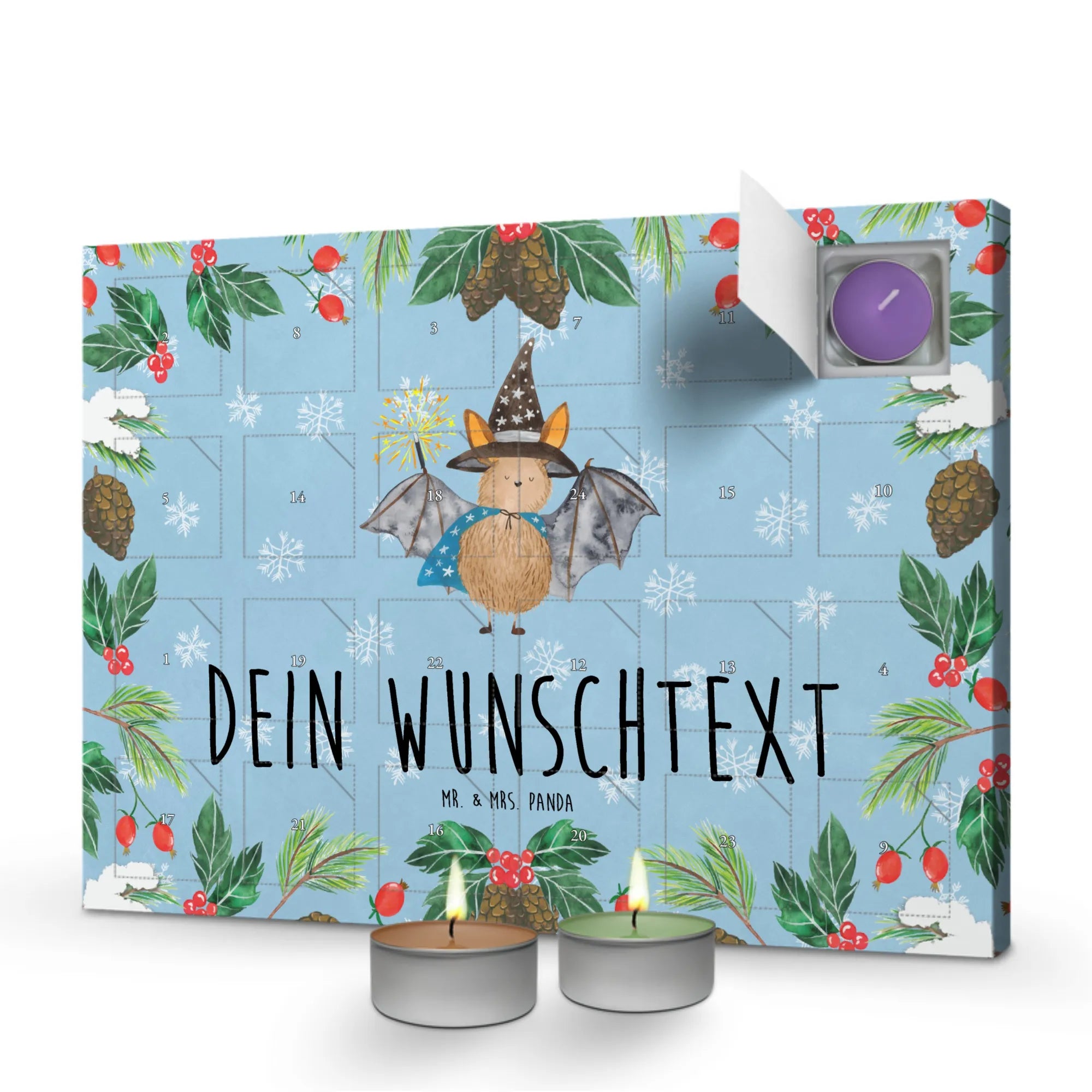 Der personalisierte Duftkerzen Adventskalender "Fledermaus Zauberer" von Mr. & Mrs. Panda ist das perfekte Geschenk für alle, die die magische Atmosphäre der Vorweihnachtszeit lieben. Mit liebevoll gestalteten Motiven und inspirierenden Sprüchen sorgt dieser Adventskalender für gute Laune und stimmungsvolle Momente. Jeden Tag eine andere, weihnachtliche Duftkerze: Vanille, Lavendel, Grüner Tee, Apfel-Zimt, Granatapfel und Oud Wood – jeder Duft ist ein kleines Stückchen Magie, das du jeden Tag genießen kannst.
