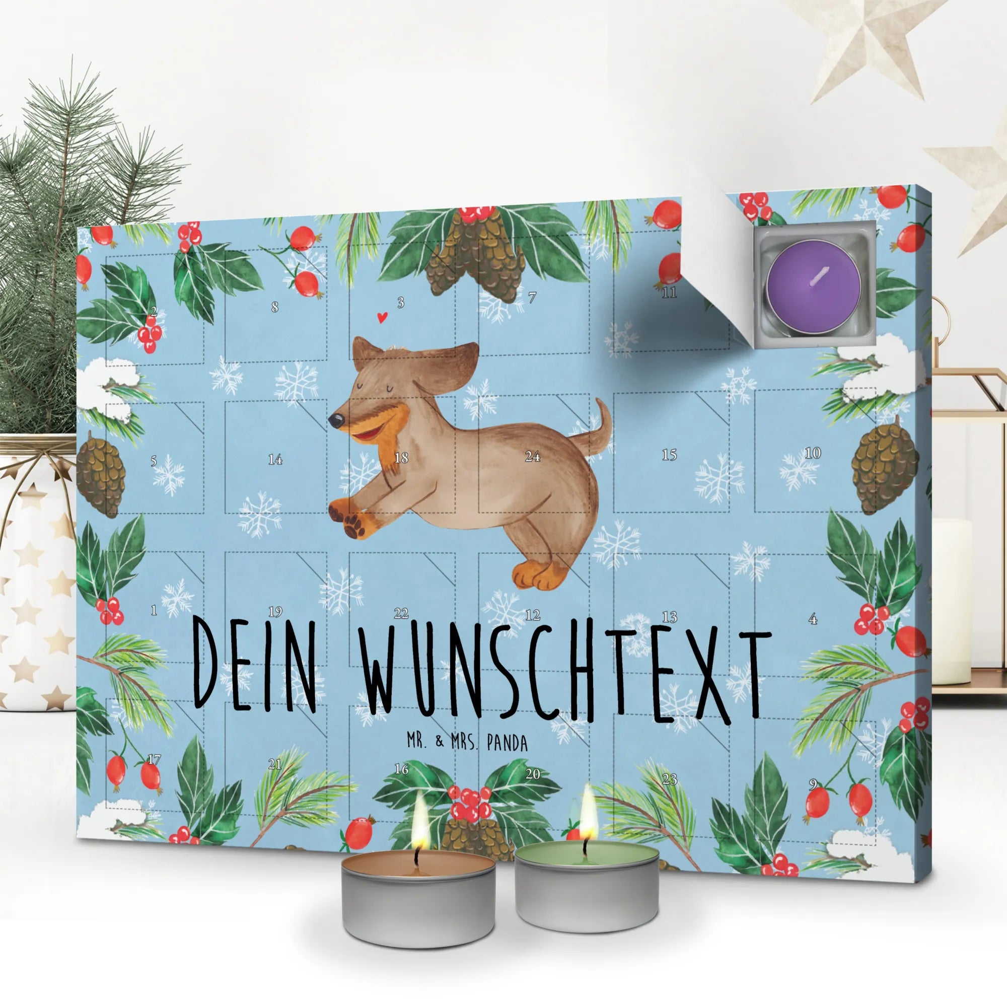 Der personalisierte Duftkerzen Adventskalender mit dem fröhlichen Dackelmotiv von Mr. & Mrs. Panda ist das ideale Geschenk für alle Hundeliebhaber und Hundebesitzer. Mit diesem bezaubernden Adventskalender bringst du Freude und Wärme in die Vorweihnachtszeit. Jeder Tag überrascht dich mit einem neuen, herrlichen Duft, sei es die süße Vanille, der entspannende Lavendel oder die herzerwärmenden Aromen von Apfel-Zimt. Dieser Kalender ist nicht nur ein schöner Blickfang in jedem Zuhause, sondern sorgt auch für stimmungsvolle Momente in einem hektischen Alltag.