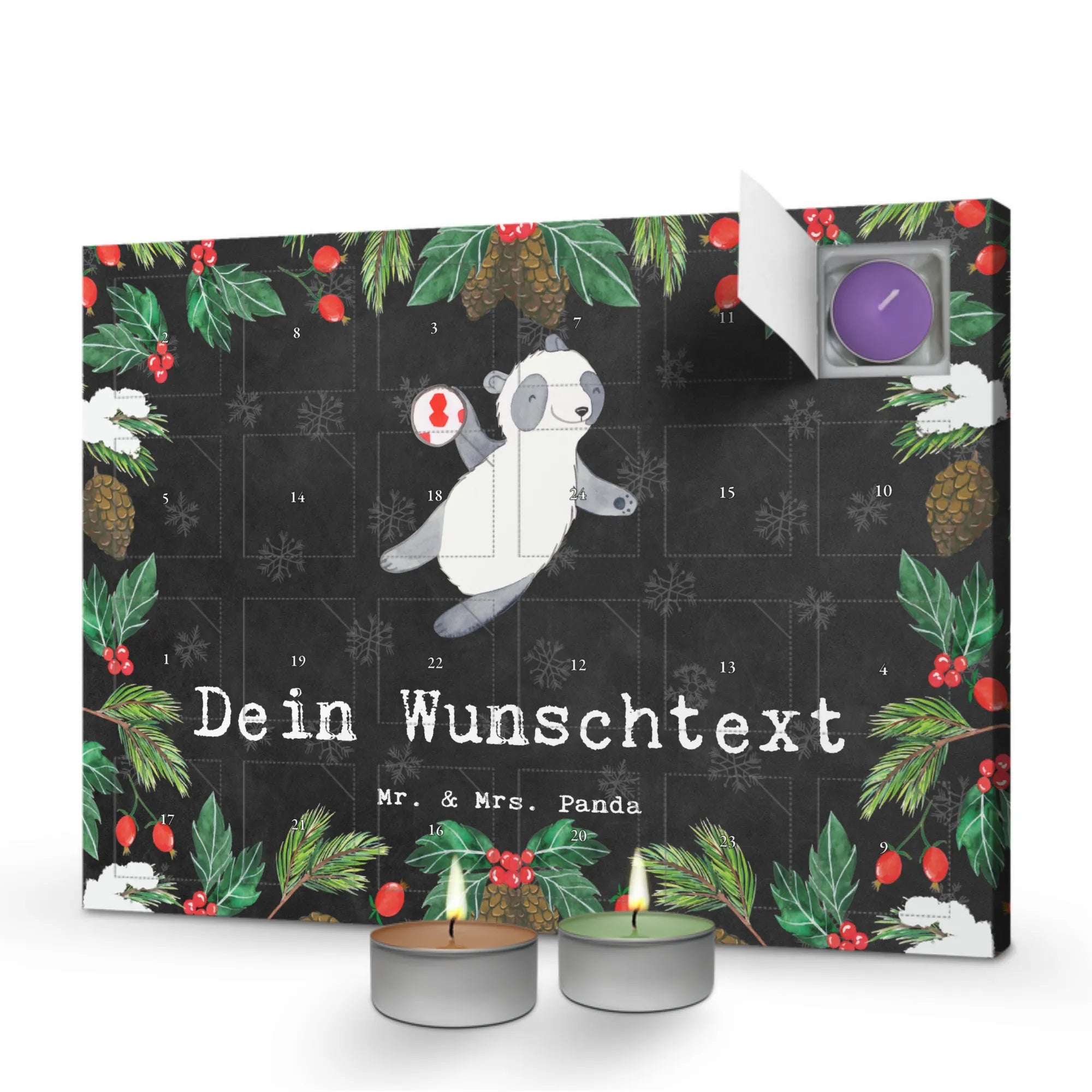 Personalisierter Duftkerzen Adventskalender Panda Handball spielen - Kreidetafel