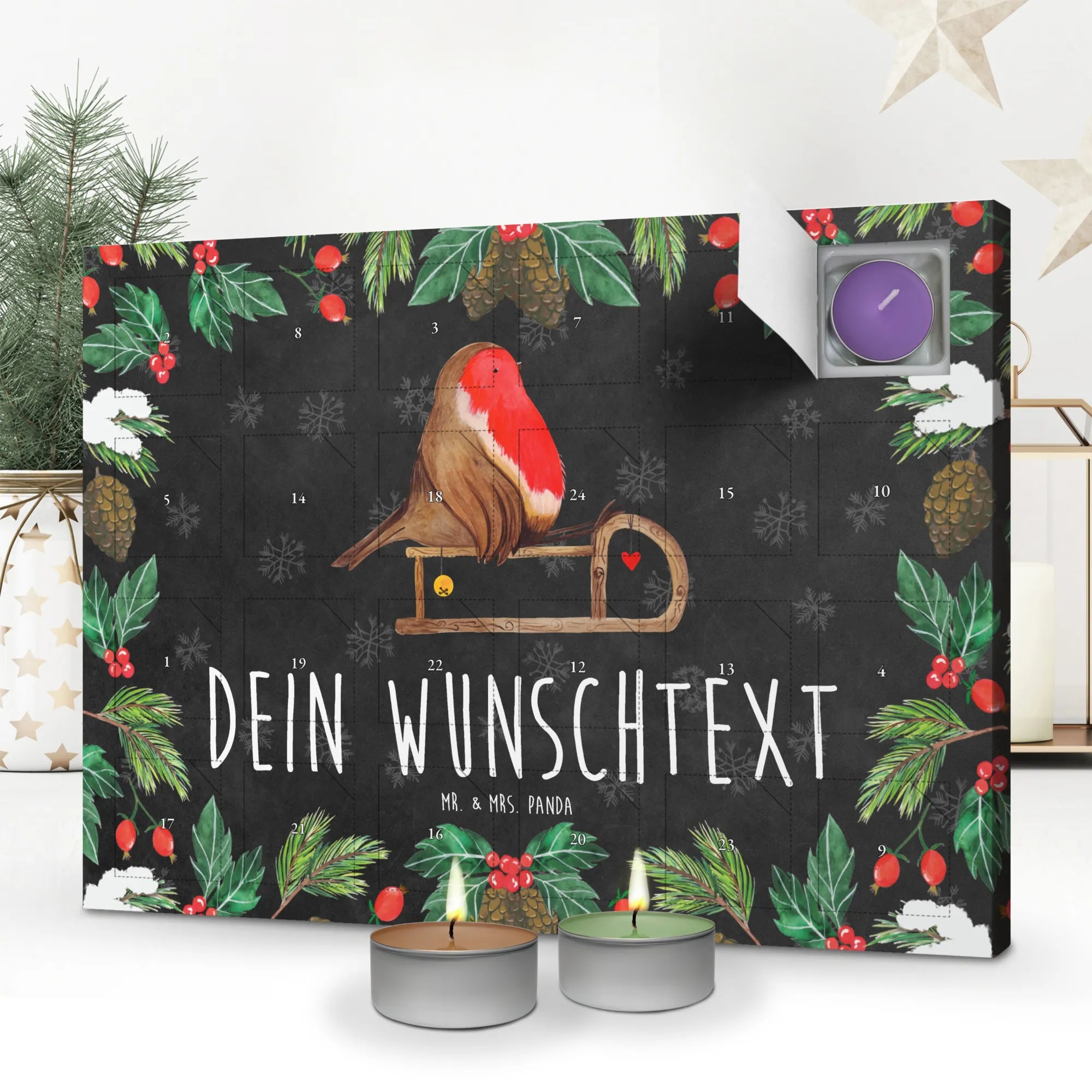 Der personalisierte Duftkerzen Adventskalender von Mr. & Mrs. Panda ist das perfekte Geschenk für die besinnliche Adventszeit! Mit seinem süßen Rotkehlchen auf einem Holzschlitten aus unserer Winter Kollektion bringt er nicht nur Freude, sondern auch eine wunderbare Duftvielfalt in dein Zuhause. Stelle dir vor, wie du jeden Tag im Dezember eine neue, weihnachtliche Aromatherapie genießt!