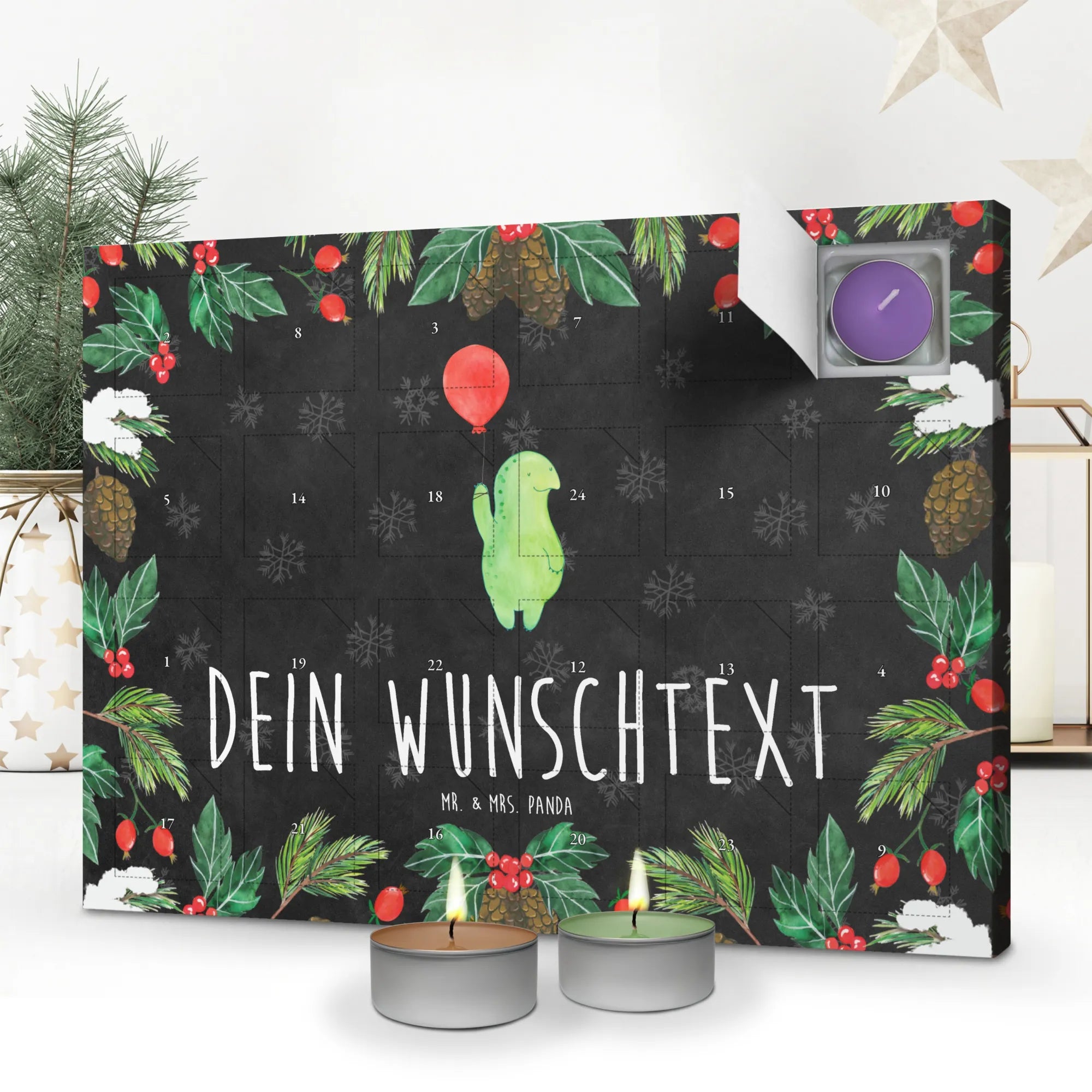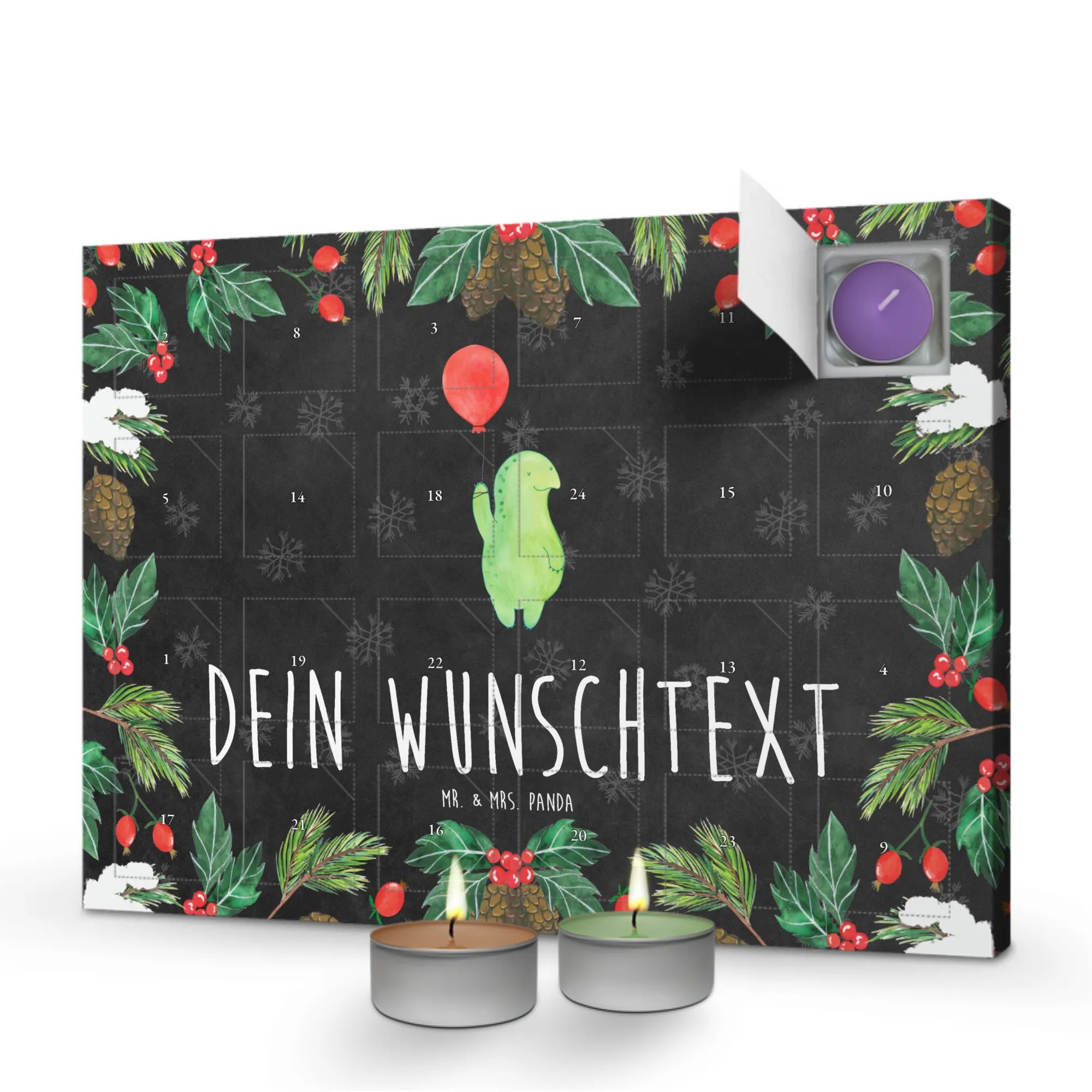 Entdecke den zauberhaften personalisierten Duftkerzen Adventskalender mit dem Motiv Schildkröte Luftballon von Mr. & Mrs. Panda! Dieser besondere Adventskalender ist das perfekte Geschenk für alle Schildkröten-Fans und ermöglicht dir, jeden Tag einen anderen weihnachtlichen Duft zu erleben.
