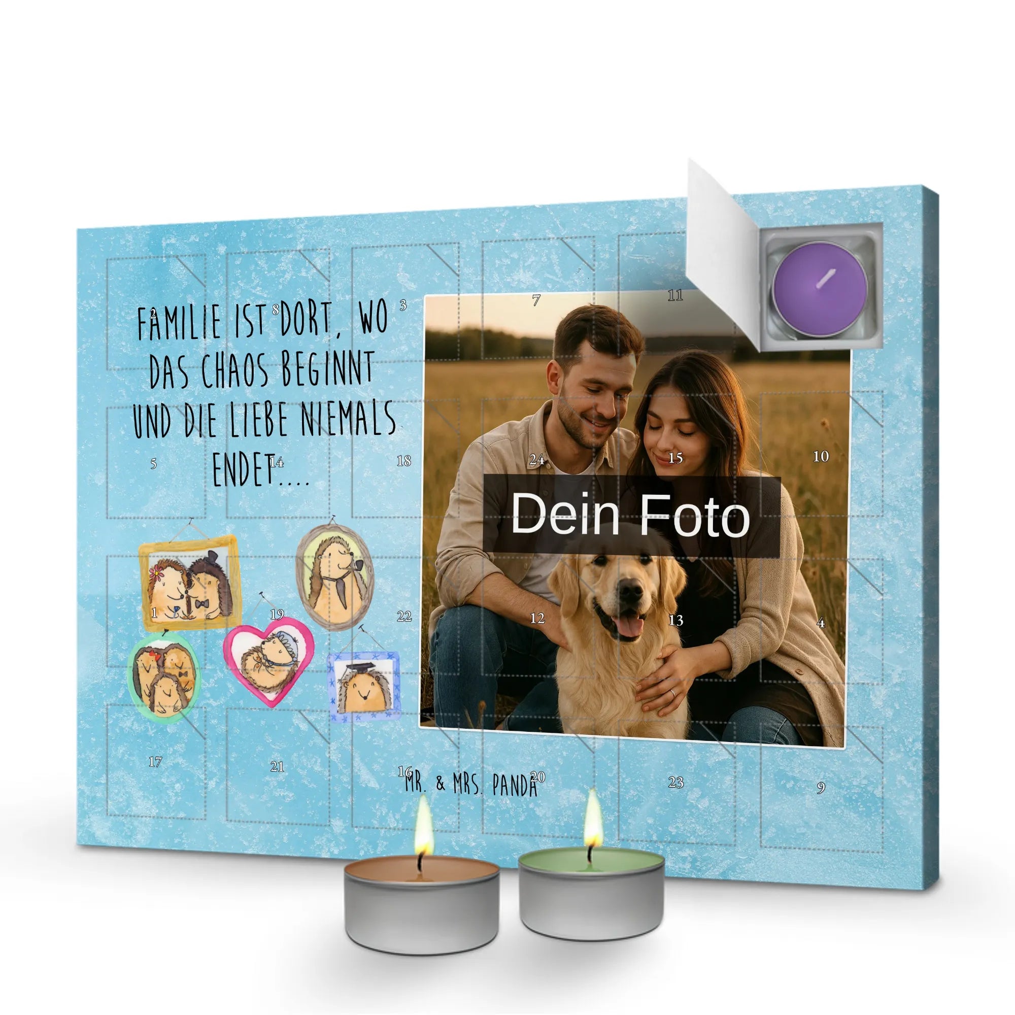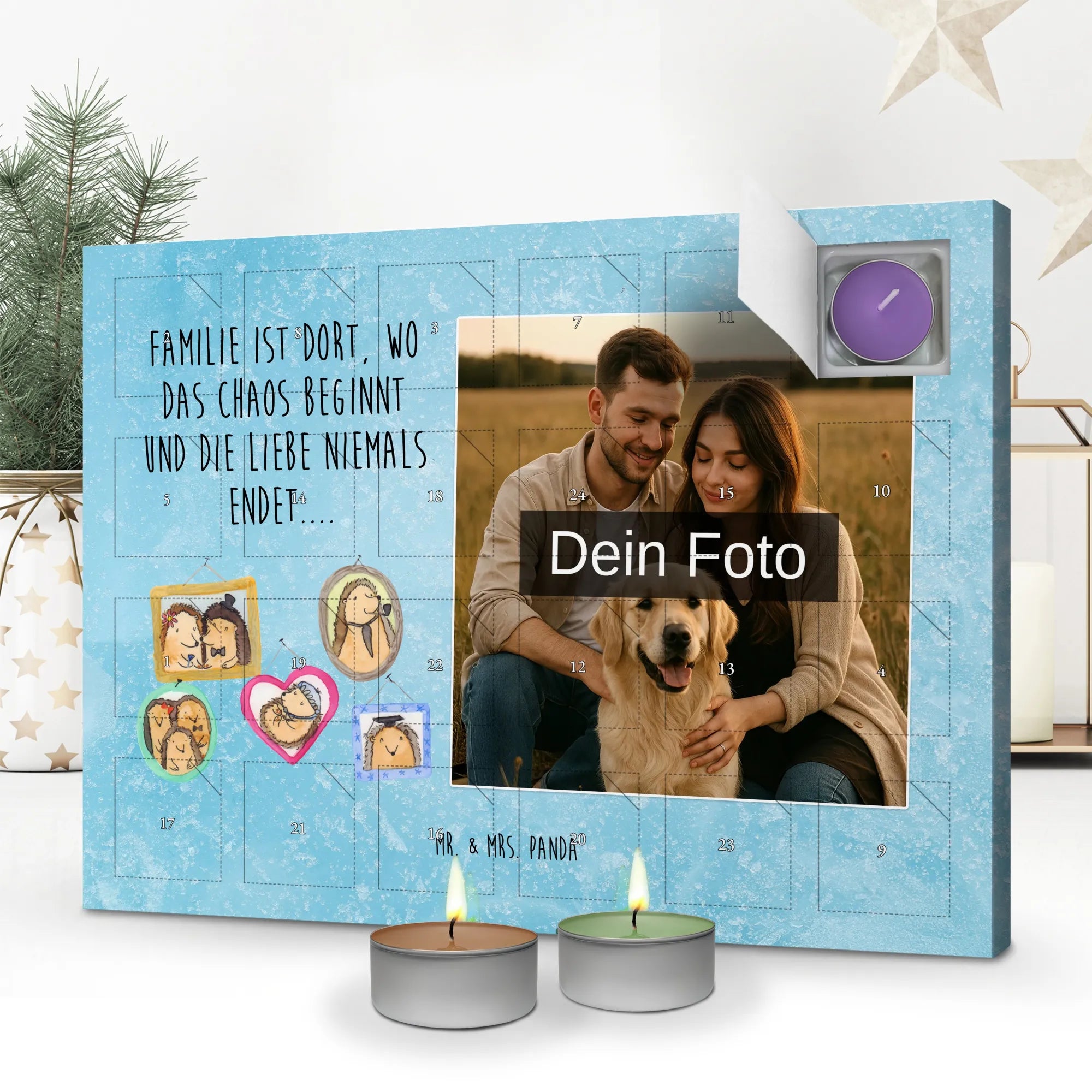 Personalisierter Adventskalender Duftkerzen Foto – von Mr. & Mrs. Panda mit Herz gestaltet. Dieser Adventskalender verbindet persönliche Erinnerungen mit zauberhaften Düften und niedlichen Illustrationen. Du kannst ein Foto deiner Wahl einfügen; die restlichen Motive und liebevollen Sprüche kommen von Mr. & Mrs. Panda. Die Front ziert eine niedliche Zeichnung von Mrs. Panda. Hinter den Türchen verbergen sich sechs unterschiedliche Düfte: Vanille, Lavendel, Grüner Tee, Apfel-Zimt, Granatapfel und Oud Wood – für abwechslungsreiche Duftmomente im Dezember. Material: stabiler Adventskalender-Karton. Vielseitig: sowohl zum Hinstellen als auch zum Aufhängen geeignet. Maße: Breite: 340 mm, Höhe: 247 mm, Tiefe: 18 mm. Bitte lade nur Fotos in guter Qualität und ausreichender Auflösung hoch, achte auf den richtigen Bildausschnitt und darauf, dass du die Bildrechte besitzt. Wichtiger Hinweis: Die Fotos werden weder aufbereitet noch zugeschnitten; personalisierte Artikel sind vom Rückgaberecht ausgeschlossen. Sicherheitshinweis: Kerze nie ohne Unterlage verwenden. Der Kalender ist ein liebevolles Geschenk, das Persönlichkeit und Duft zu einem stimmungsvollen Adventserlebnis vereint.
