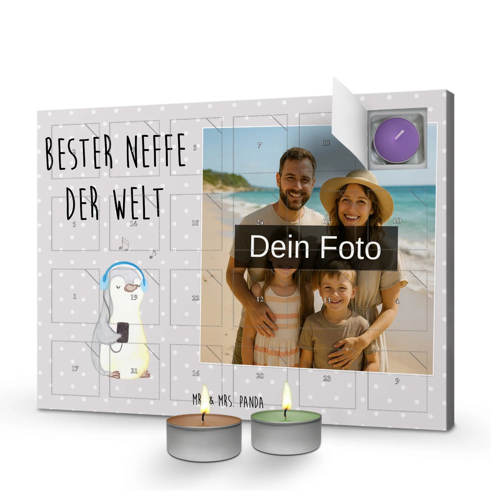 Der personalisierte Duftkerzen Foto Adventskalender mit dem süßen Pinguin "Bester Neffe der Welt" ist das perfekte Geschenk für deinen Neffen. Er hilft dir, die Vorweihnachtszeit auf eine besonders liebevolle Weise zu genießen und ist eine wunderschöne Möglichkeit, deinem Neffen zu zeigen, wie viel er dir bedeutet.