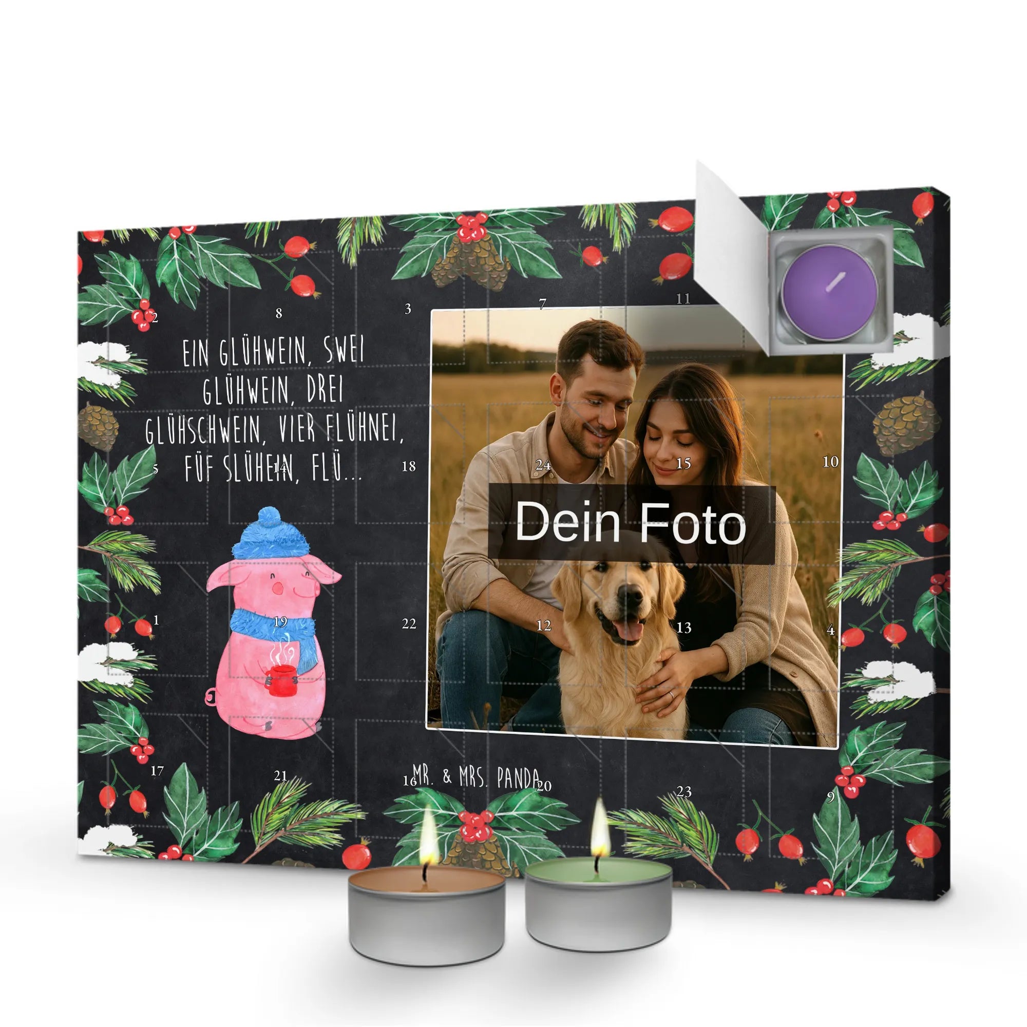 Foto Adventskalender mit Duftkerzen personalisiert – ein zauberhaftes Geschenk von Mr. & Mrs. Panda für die Adventszeit! Der Kalender ist bedruckt mit liebevollen Sprüchen und Motiven und trägt auf der Vorderseite eine charmante Zeichnung von Mrs. Panda. Du kannst dein eigenes Foto hinzufügen, damit jeder Tag noch persönlicher wird. Hinter den Türchen erwarten dich sechs verschiedene Düfte: Vanille, Lavendel, Grüner Tee, Apfel-Zimt, Granatapfel und Oud Wood. Der Kalender besteht aus stabilem Adventskalender-Karton und lässt sich entweder aufstellen oder an der Wand aufhängen. Maße: Breite: 340 mm, Höhe: 247 mm, Tiefe: 18 mm. Achte beim Hochladen deines Fotos auf hohe Auflösung, passenden Bildausschnitt und die Einhaltung der Bildrechte – wir drucken Fotos ohne Nachbearbeitung oder Zuschnitt. Hinweis: Kerze nie ohne Unterlage verwenden. Rücknahme ausgeschlossen bei personalisierten Foto-Artikeln. Der Adventskalender enthält dein personalisiertes Foto; die übrigen Motive und Sprüche stammen von Mr. & Mrs. Panda und sorgen für gemütliche Adventstage.