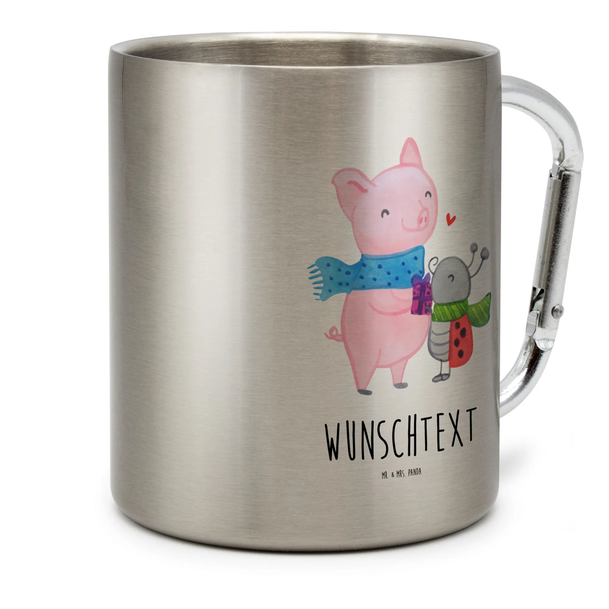 Der liebevoll handgezeichnete Aufdruck zeigt das fröhliche Glühschwein in seinem blauen Punkteschal und den süßen, neugierigen Marienkäfer, der mit einem roten Herz die Freundschaft und das Teilen verkörpert. Diese herzerwärmende Illustration macht die Tasse nicht nur zum praktischen Gebrauchsgut, sondern auch zu einem zauberhaften Sammlerstück. Ob als Weihnachtsgeschenk für Freunde, als selbstgemachtes Präsent für die Familie oder zur persönlichen Freude – die personalisierte Edelstahltasse ist genau das richtige für jeden Anlass.