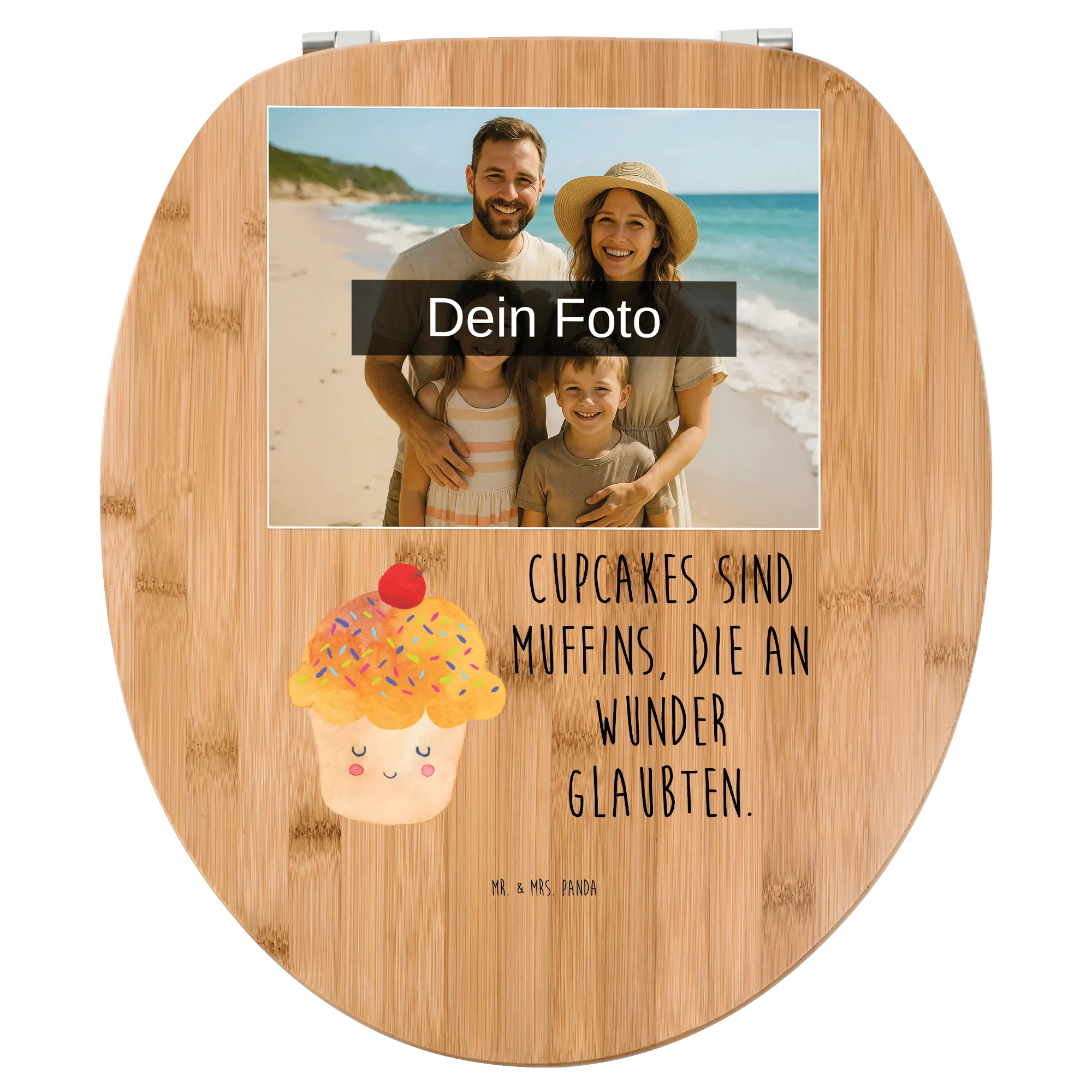 Mach dein Badezimmer zu einem besonderen Ort mit unserem personalisierten Foto WC Sitz Motiv! Der Sitz hat die Maße von 430 mm x 370 mm x 50 mm und ist wahlweise aus hochwertigem Bambus Holz (braun) oder robustem MDF Holz (weiß) gefertigt. Dieser liebevoll gestaltete Toilettensitz wird mit süßen Motiven und zauberhaften Sprüchen von Mr. & Mrs. Panda bedruckt. Lass deiner Kreativität freien Lauf und personalisiere ihn mit deinem eigenen Wunschfoto! Achte darauf, dass das hochgeladene Motiv hochauflösend ist, damit der Druck klar und lebendig wird. Denk daran, den richtigen Bildausschnitt zu wählen, damit keine wichtigen Details verloren gehen. Dieser WC Sitz passt auf alle Euro-WC-Becken und ist mit einem einfachen Montageset ausgestattet. Er bietet nicht nur hohen Sitzkomfort, sondern sorgt dank seiner speziellen Eigenschaften für ein angenehmes Sitzgefühl, selbst an kalten Tagen. Mit einem süßen Motiv bringst du mehr Lebensfreude in dein Badezimmer. Pflege dein neues Schmuckstück ganz einfach mit einem feuchten Tuch und handelsüblicher Seife, ohne aggressive Putzmittel. Der hochqualitative UV-Druck sorgt dafür, dass das Motiv lange strahlend bleibt. Hol dir jetzt diesen besonderen Toilettensitz und mach dein Bad einzigartig!