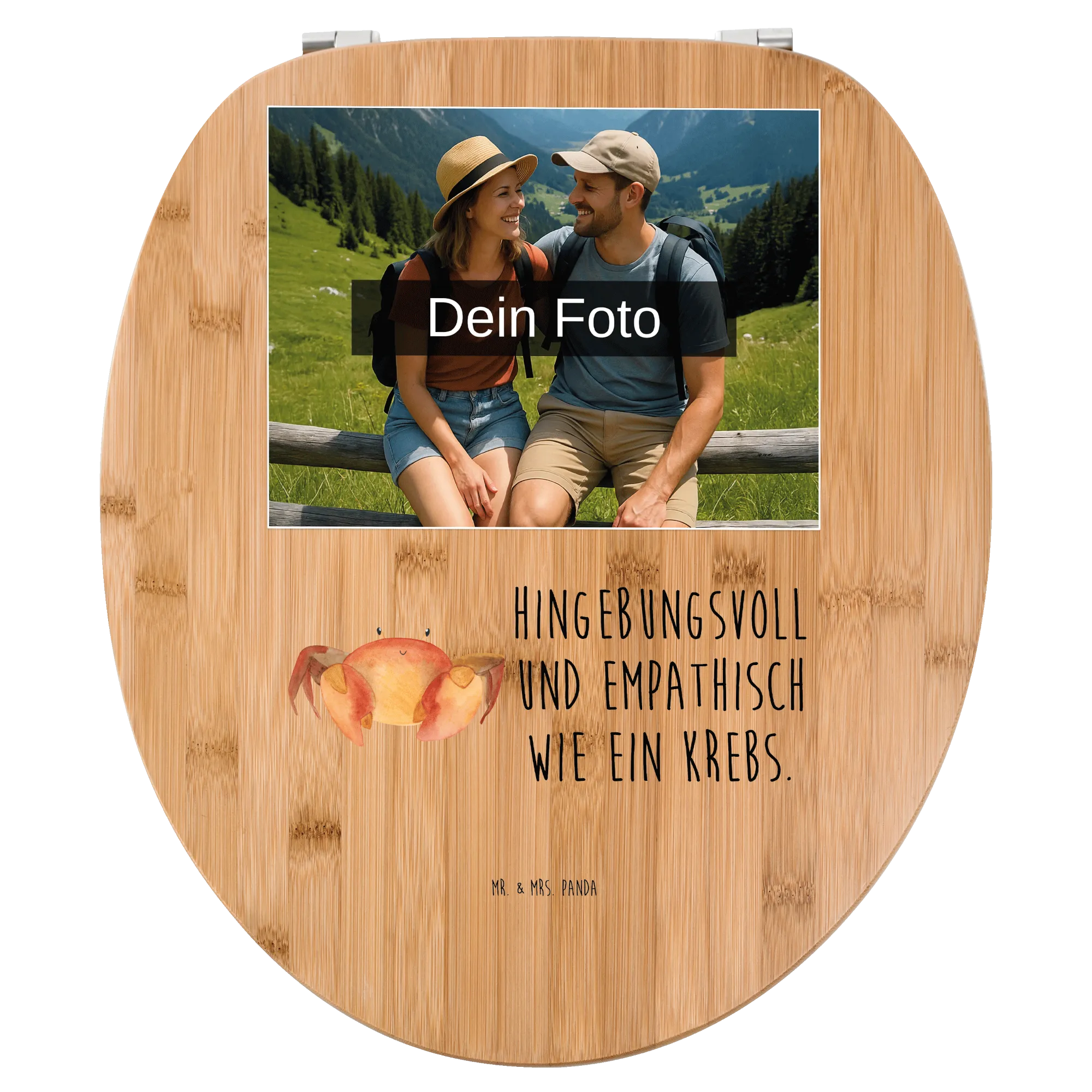 Mach dein Badezimmer zu einem besonderen Ort mit unserem personalisierten Foto WC Sitz Motiv! Der Sitz hat die Maße von 430 mm x 370 mm x 50 mm und ist wahlweise aus hochwertigem Bambus Holz (braun) oder robustem MDF Holz (weiß) gefertigt. Dieser liebevoll gestaltete Toilettensitz wird mit süßen Motiven und zauberhaften Sprüchen von Mr. & Mrs. Panda bedruckt. Lass deiner Kreativität freien Lauf und personalisiere ihn mit deinem eigenen Wunschfoto! Achte darauf, dass das hochgeladene Motiv hochauflösend ist, damit der Druck klar und lebendig wird. Denk daran, den richtigen Bildausschnitt zu wählen, damit keine wichtigen Details verloren gehen. Dieser WC Sitz passt auf alle Euro-WC-Becken und ist mit einem einfachen Montageset ausgestattet. Er bietet nicht nur hohen Sitzkomfort, sondern sorgt dank seiner speziellen Eigenschaften für ein angenehmes Sitzgefühl, selbst an kalten Tagen. Mit einem süßen Motiv bringst du mehr Lebensfreude in dein Badezimmer. Pflege dein neues Schmuckstück ganz einfach mit einem feuchten Tuch und handelsüblicher Seife, ohne aggressive Putzmittel. Der hochqualitative UV-Druck sorgt dafür, dass das Motiv lange strahlend bleibt. Hol dir jetzt diesen besonderen Toilettensitz und mach dein Bad einzigartig!