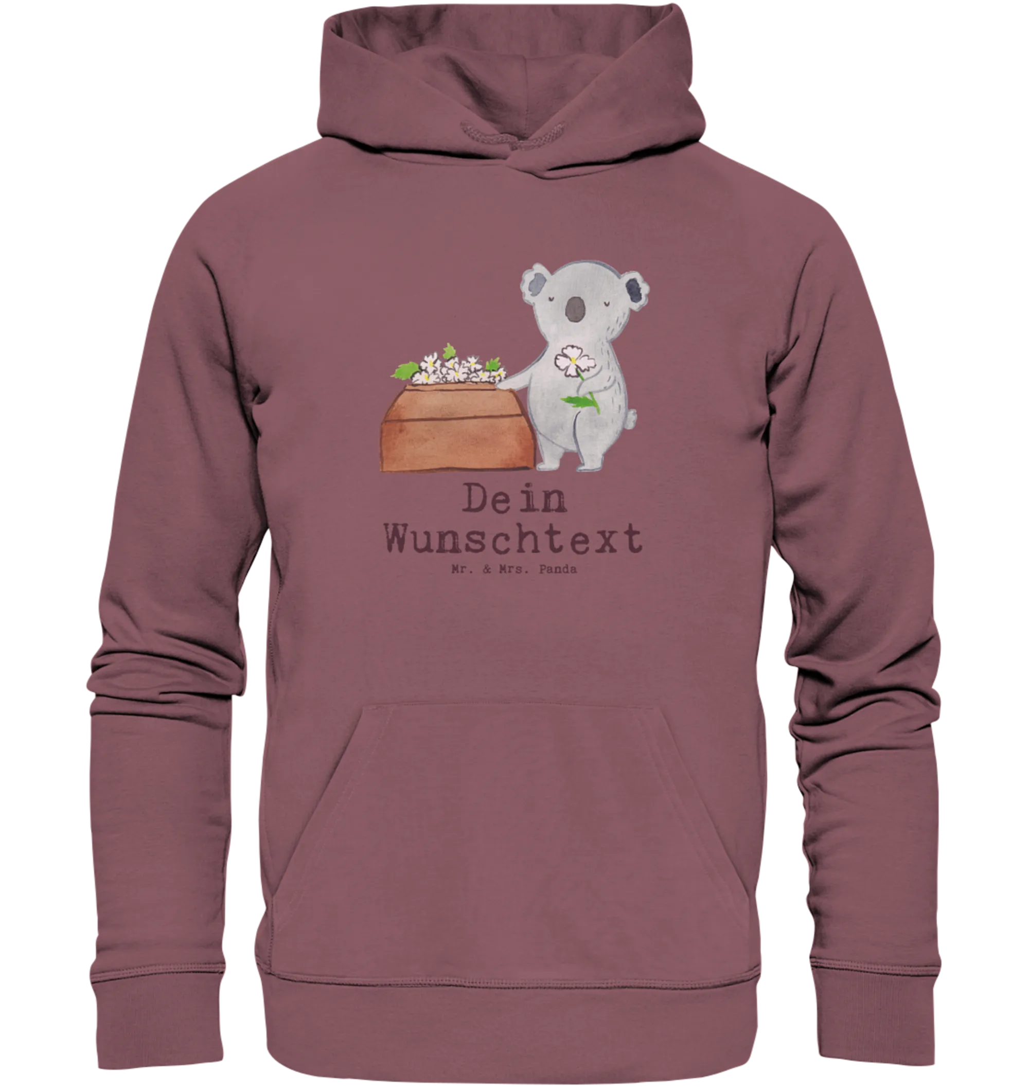 Mit dem liebevoll designten Motiv – einem niedlichen Koala, der ehrfürchtig vor einem Sack mit Blumen steht – wird dieser Hoodie zum perfekten Begleiter im Alltag, egal ob bei der Arbeit oder in der Freizeit. Du kannst den Hoodie mit deinem Wunschtext oder Namen personalisieren, was ihn besonders individuell macht.