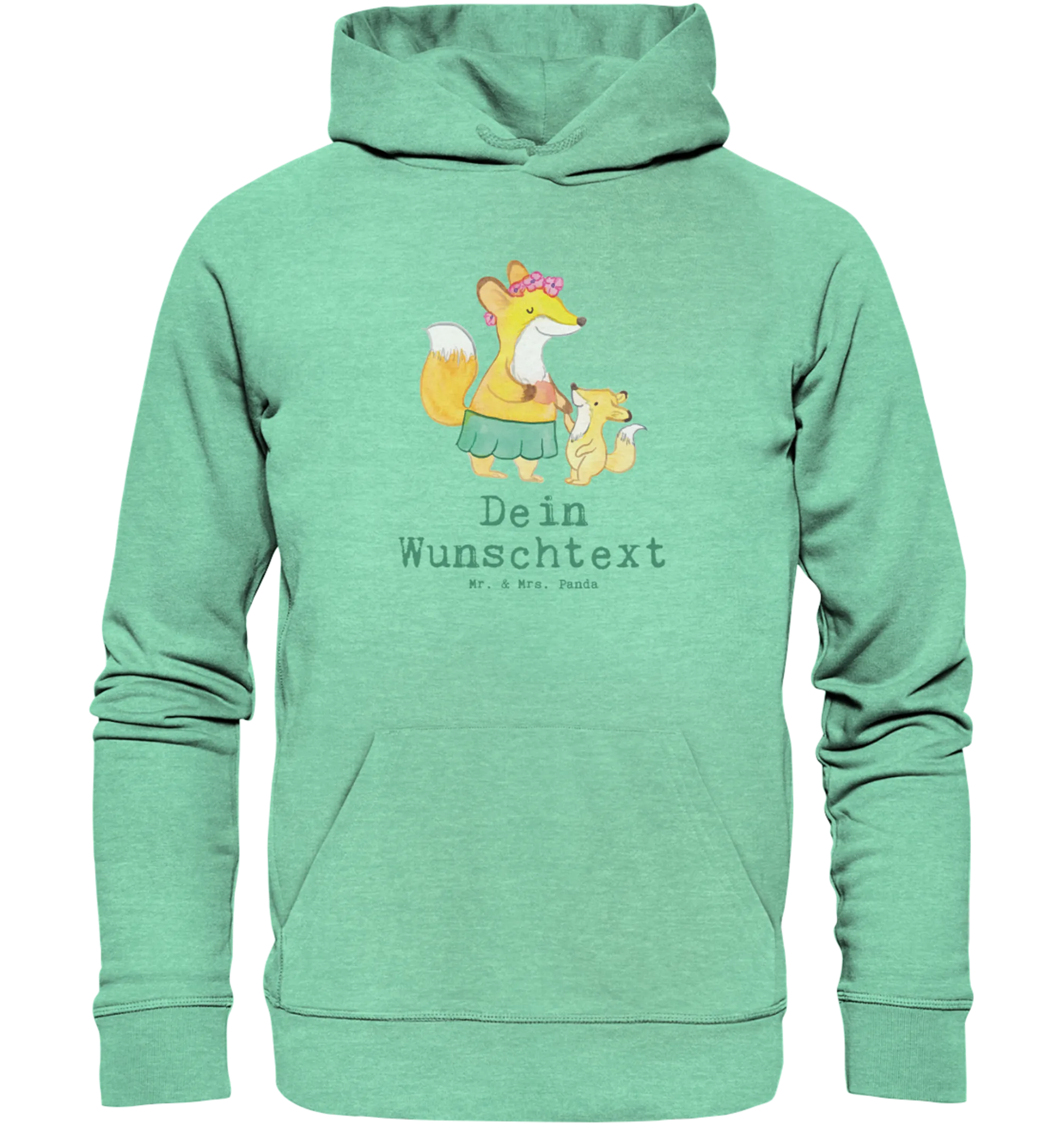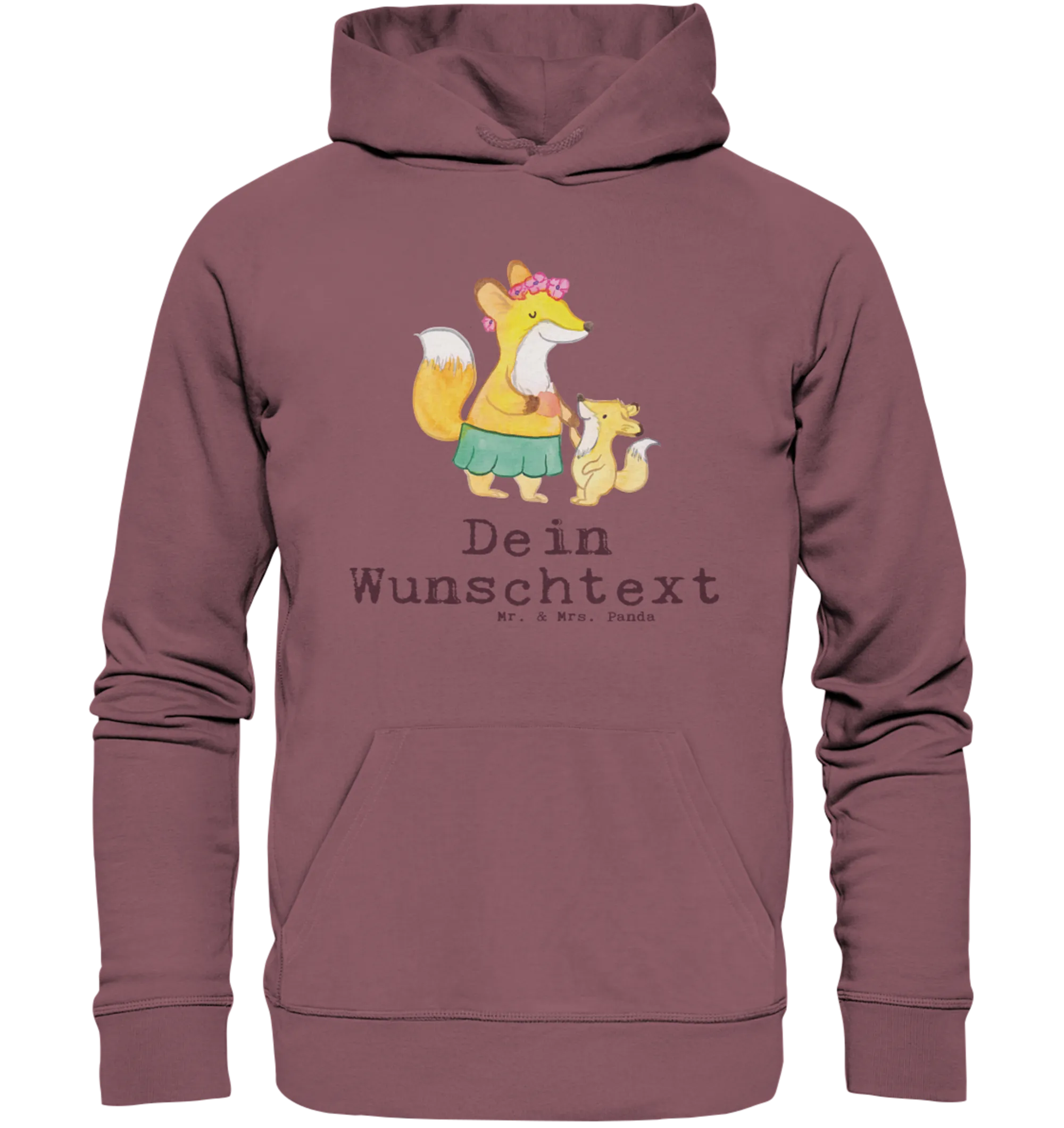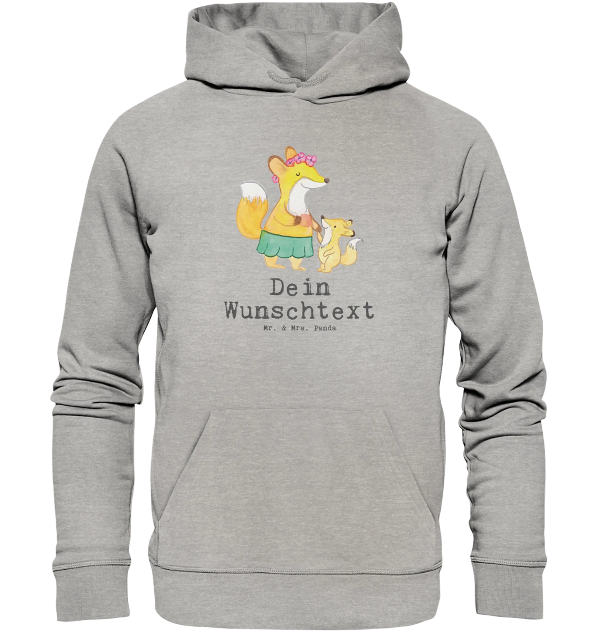 Das Motiv zeigt einen niedlichen Fuchs mit Blumenkranz und ein fröhliches Fuchskind an der Hand, handgezeichnet in zarten Aquarellfarben von Mrs. Panda. Der freche Slogan „Du bist nur ein halber Mensch, wenn du keine Mutter bist.“ macht den Hoodie zu einer kleinen Liebesbotschaft für alle Mütter. Zudem kannst Du den Hoodie mit einem eigenen Wunschname personalisieren – so wird er zum einzigartigen Erinnerungsstück.