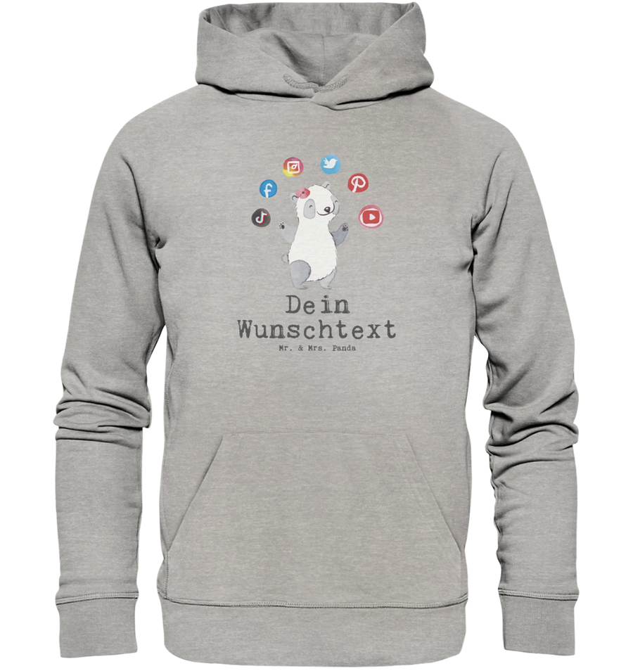 Das Besondere an diesem Hoodie ist, dass du ihn mit deinem eigenen Wunschtext oder Namen personalisieren kannst. Der Print zeigt einen bezaubernden Panda, der mit Social Media Icons jongliert, zusammen mit dem humorvollen Spruch: "Du bist nur ein halber Mensch, wenn du keine Online Marketing Manager bist." Diese liebevolle Gestaltung macht ihn zu einem einzigartigen Geschenk für jeden Anlass – sei es zum Jobbeginn, zur Beförderung oder einfach nur, um einem geschätzten Kollegen zu danken.