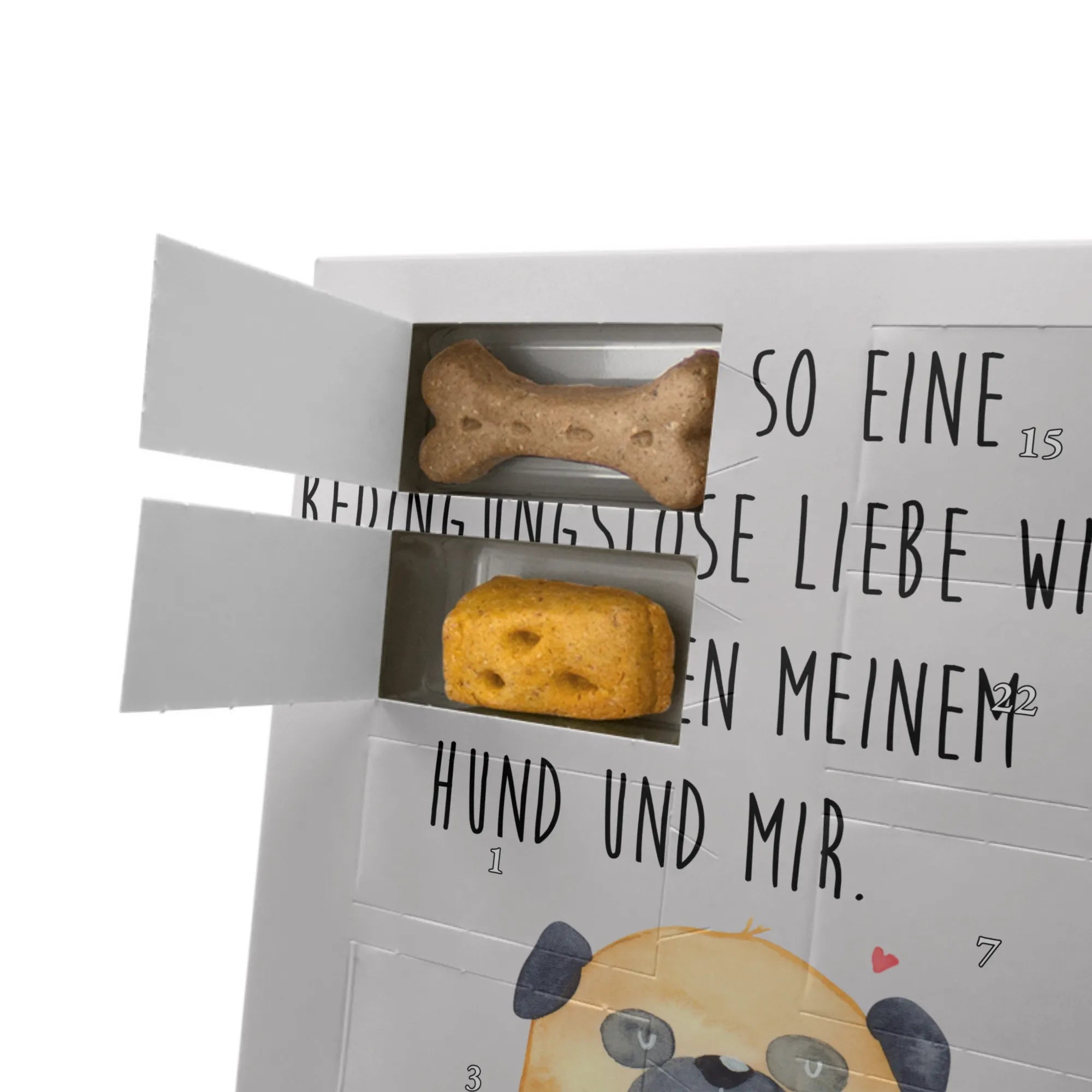 Mit dem niedlichen Mops-Motiv und dem Spruch 'Nichts ist so eine bedingungslose Liebe wie die zwischen meinem Hund und mir' wird dieser Adventskalender nicht nur zum kulinarischen Highlight, sondern auch zur emotionalen Verbindung zwischen dir und deinem Hund. Es ist das ideale Geschenk für Hundebesitzer, die ihren Liebling in der besinnlichen Zeit des Jahres besonders verwöhnen wollen. Die schöne, seidenmatte Oberflächenveredelung verleiht dem Kalender zudem einen besonders eleganten Look.