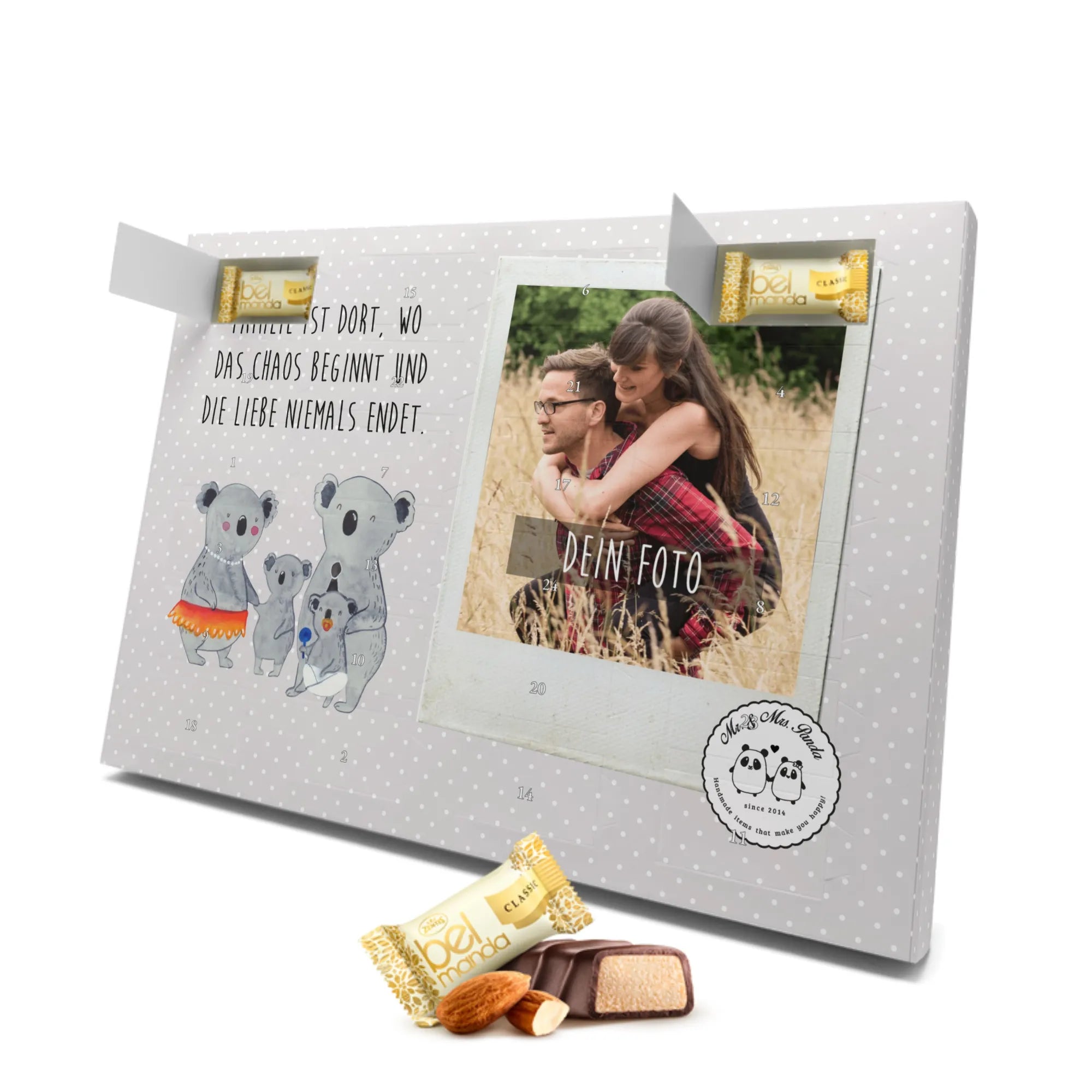 Der personalisierte Marzipan Foto Adventskalender von Mr. & Mrs. Panda ist ein ganz besonderes Geschenk für die Familie und alle, die dir am Herzen liegen. Mit dem niedlichen Motiv der Koala Familie bringt dieser Kalender nicht nur Freude, sondern auch eine Portion Liebe und Vertrautheit in die Vorweihnachtszeit.