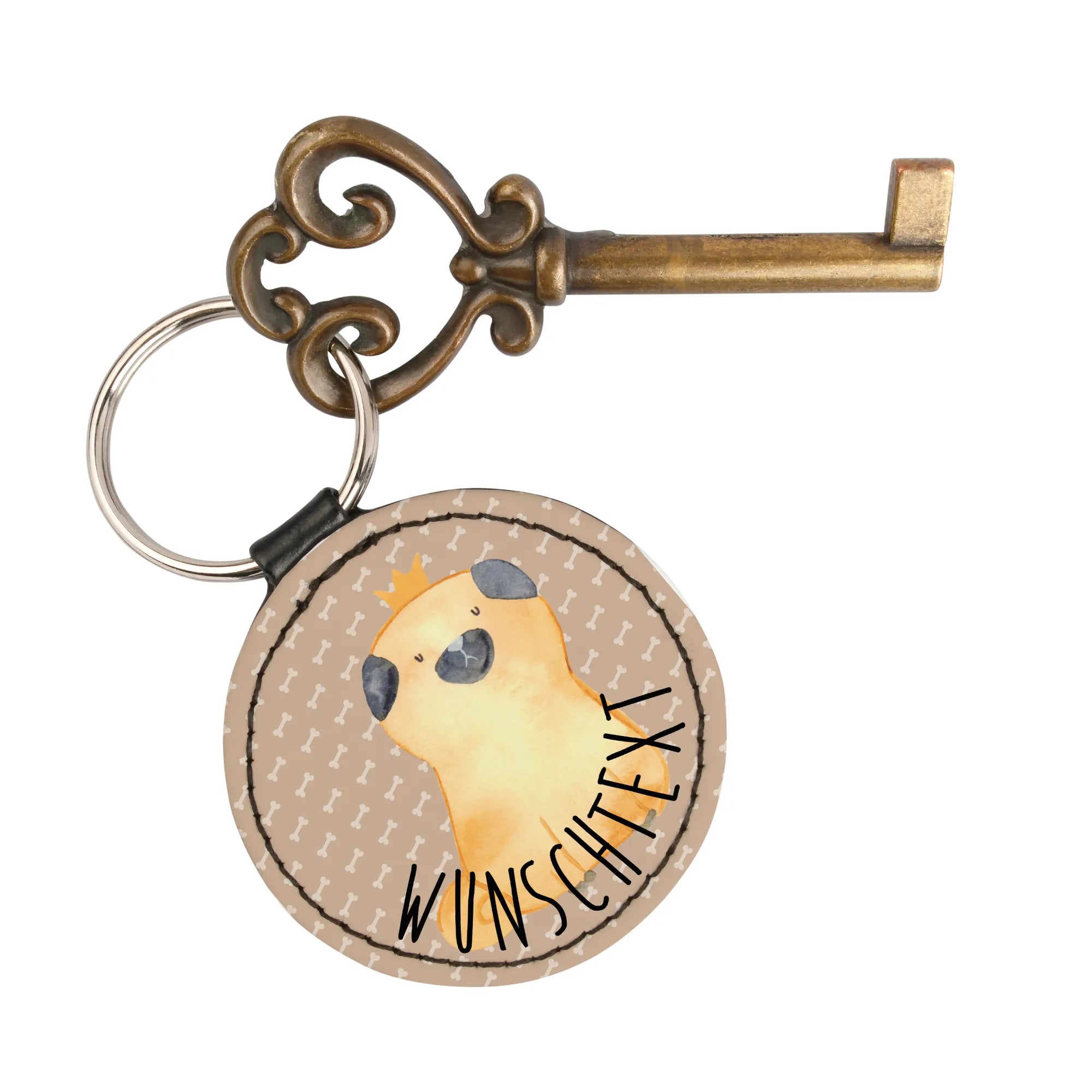 Der personalisierte Schlüsselanhänger Mops Krone von Mr. & Mrs. Panda ist das ideale Geschenk für jeden Hundeliebhaber. Mit einem süßen Mops, der stolz eine Krone trägt, und dem witzigen Spruch "In unserem Haus gibt es keine Kinder. Der Hund war allergisch." wird dieser Schlüsselanhänger schnell zum Highlight jedes Schlüsselbundes.