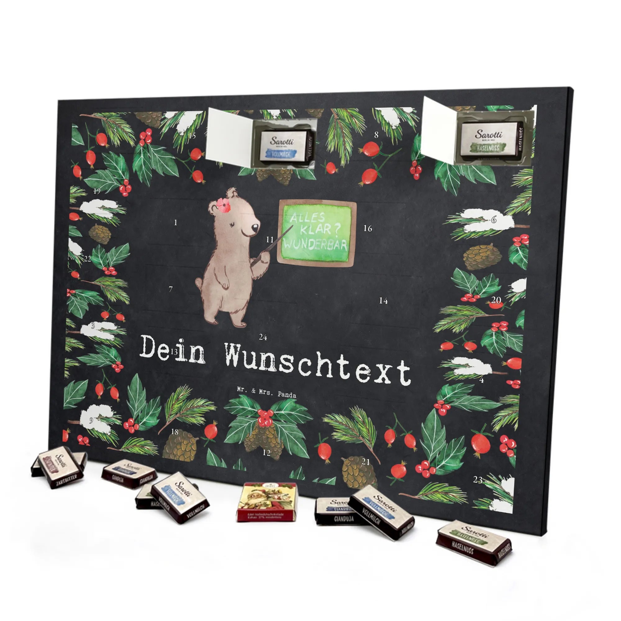 🐼 PERSONALISIERTER SCHOKO-ADVENTSKALENDER: Mit Wunschtext, bedruckt mit Mr. & Mrs. Panda Motiven, gefüllt mit MARKENNAMEN Schokolade.
