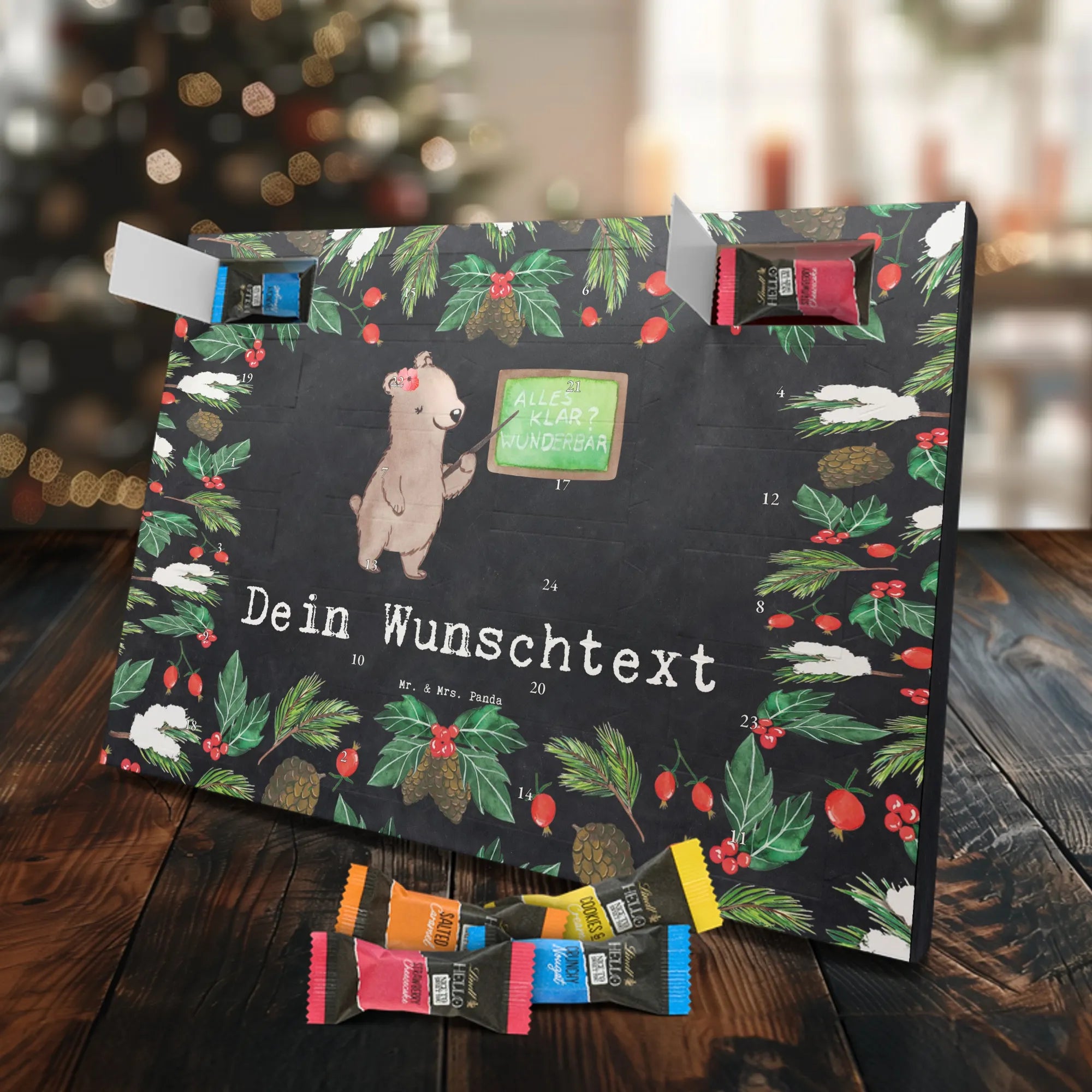 Individueller Schoko Adventskalender von Mr. & Mrs. Panda – das perfekte, persönliche Geschenk für die Adventszeit! Dieser Kalender wurde liebevoll gestaltet, mit fröhlichen Motiven und charmanten Sprüchen bedruckt und lässt sich mit deinem Wunschnamen oder einem individuellen Text versehen. Die brillante Druckqualität gepaart mit seidenmatter Oberflächenveredelung verleiht dem Kalender einen edlen Look; auch die Seitenflächen sind bedruckt, damit das Design rundum stimmig ist. Maße: 233 mm x 178 mm x 24 mm. Praktisch: Du kannst den Kalender aufstellen oder an der Wand aufhängen – ganz nach deinem Geschmack. Gefüllt mit Lindt Lindor Schokolade: 24 einzeln verpackte Markenschokoladen Kugeln in drei verführerischen Sorten. Geschmacksrichtungen: Vollmilch, Feinherb und Weiße Schokolade. Zutaten: Zucker, pflanzliches Fett (Kokosnuss, Palmkern), Kakaobutter, Vollmilchpulver, Kakaomasse, Milchzucker, Magermilchpulver, Butterreinfett, Emulgator (Sojalecithin), Gerstenmalzextrakt, Aromen. Besondere Hinweise: Kann Haselnüsse und Mandeln enthalten. Überrasche deine Liebsten mit einem persönlichen Adventskalender voller kleiner Schoko-Momente und viel Vorfreude.