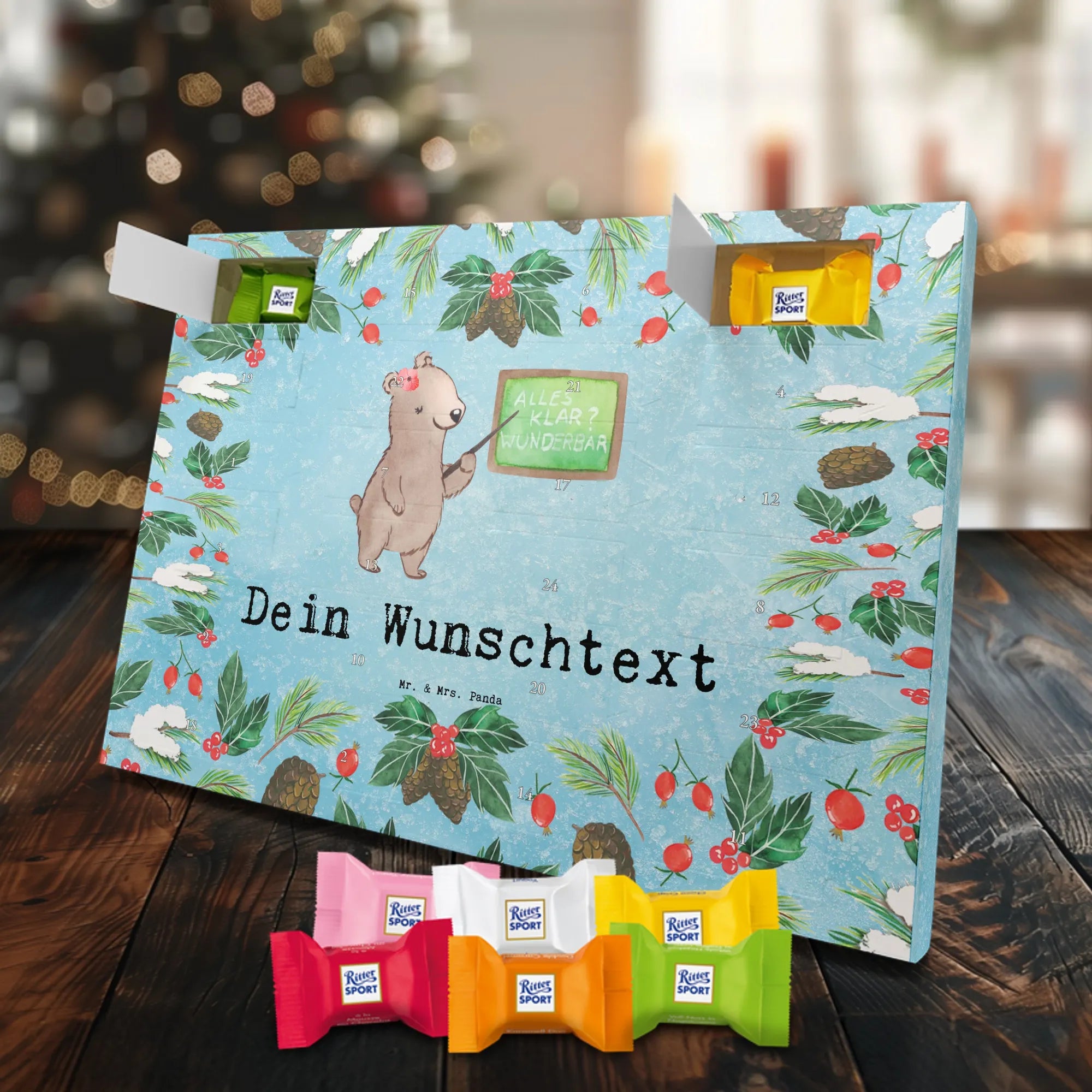 🐼 Personalisierter Adventskalender mit Wunschtext, seidenmatte Oberfläche, bedruckte Seitenflächen.