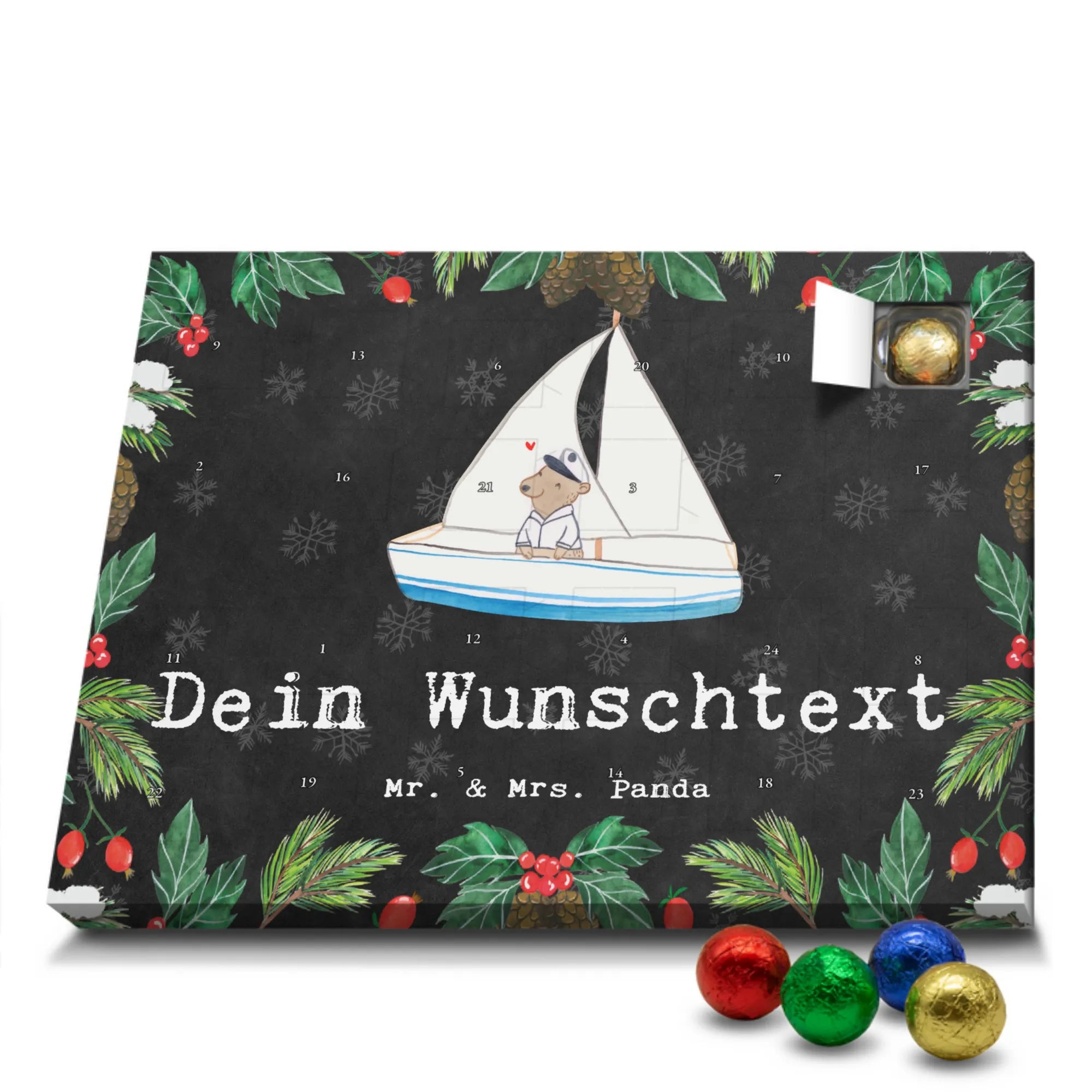 Mach die Adventszeit persönlich mit unserem Personalisierter Adventskalender mit Schokolade von Mr. & Mrs. Panda. Jeder Kalender ist liebevoll illustriert und bedruckt mit charmanten Sprüchen und Motiven – perfekt als Geschenk oder Deko für dein Zuhause. Du kannst deinen Wunschname oder einen kurzen Text hinzufügen, damit der Kalender ganz individuell wird. Die brillante Druckqualität und die seidenmatte Oberflächenveredelung sorgen für eine edle Optik, und auch die Seitenflächen sind komplett bedruckt. Maße: 233 mm x 178 mm x 24 mm. Die clevere Konstruktion erlaubt es, den Kalender aufzuhängen oder aufzustellen – flexibel und dekorativ zugleich. Gefüllt mit MARKENNAMEN Schokolade sowie köstlichen Schokoladenkugeln ist jeder Tag im Advent eine süße Überraschung. Wichtiger Hinweis: (Kann Spuren von Haselnüssen, Mandeln, Gluten und Soja enthalten!), kühl und trocken lagern! Egal ob für Kinder, Partner oder beste Freundin – dieser personalisierte Adventskalender bringt ein Lächeln und zaubert gemütliche Vorfreude. Bestell jetzt und gestalte deine Adventszeit mit einem Hauch Mr. & Mrs. Panda.