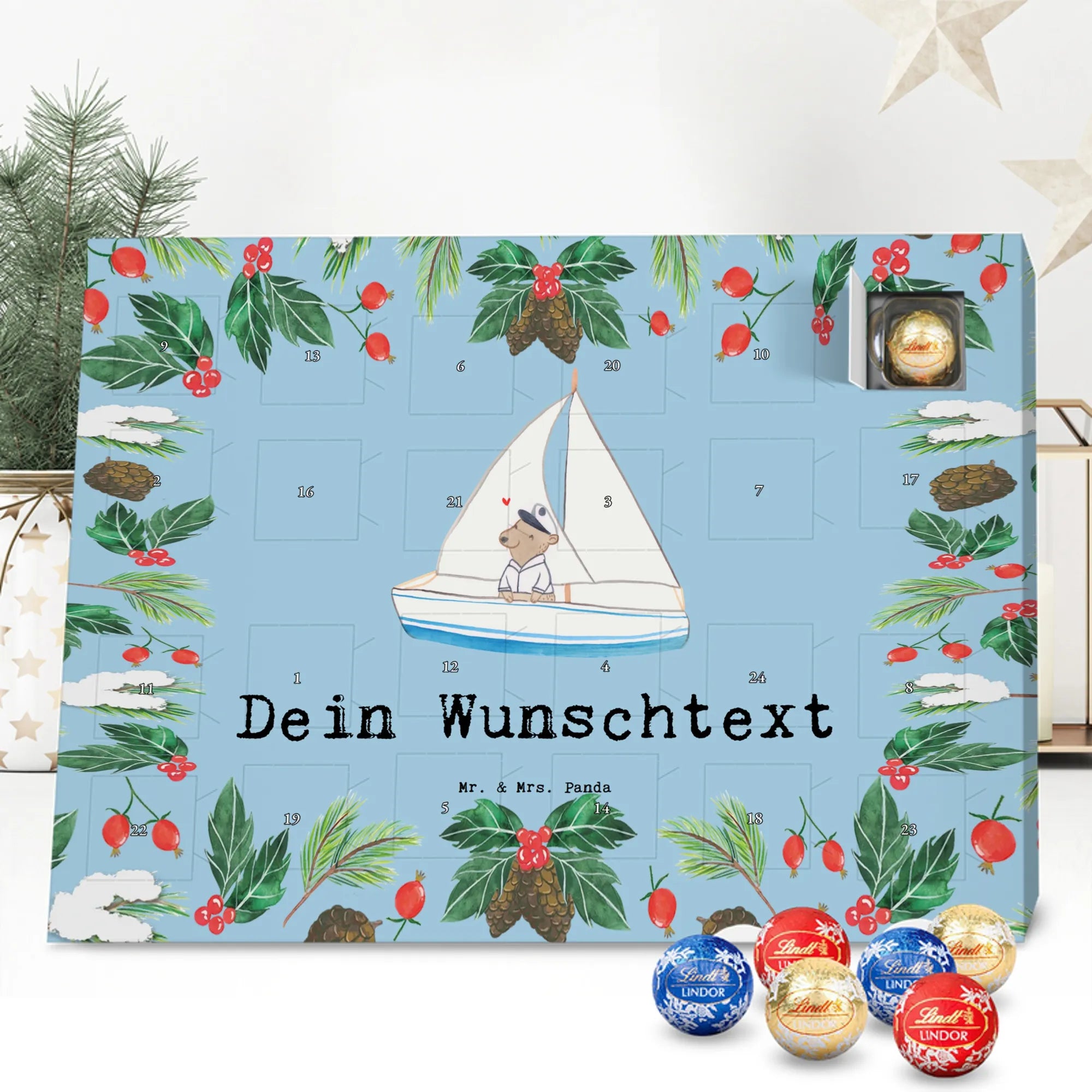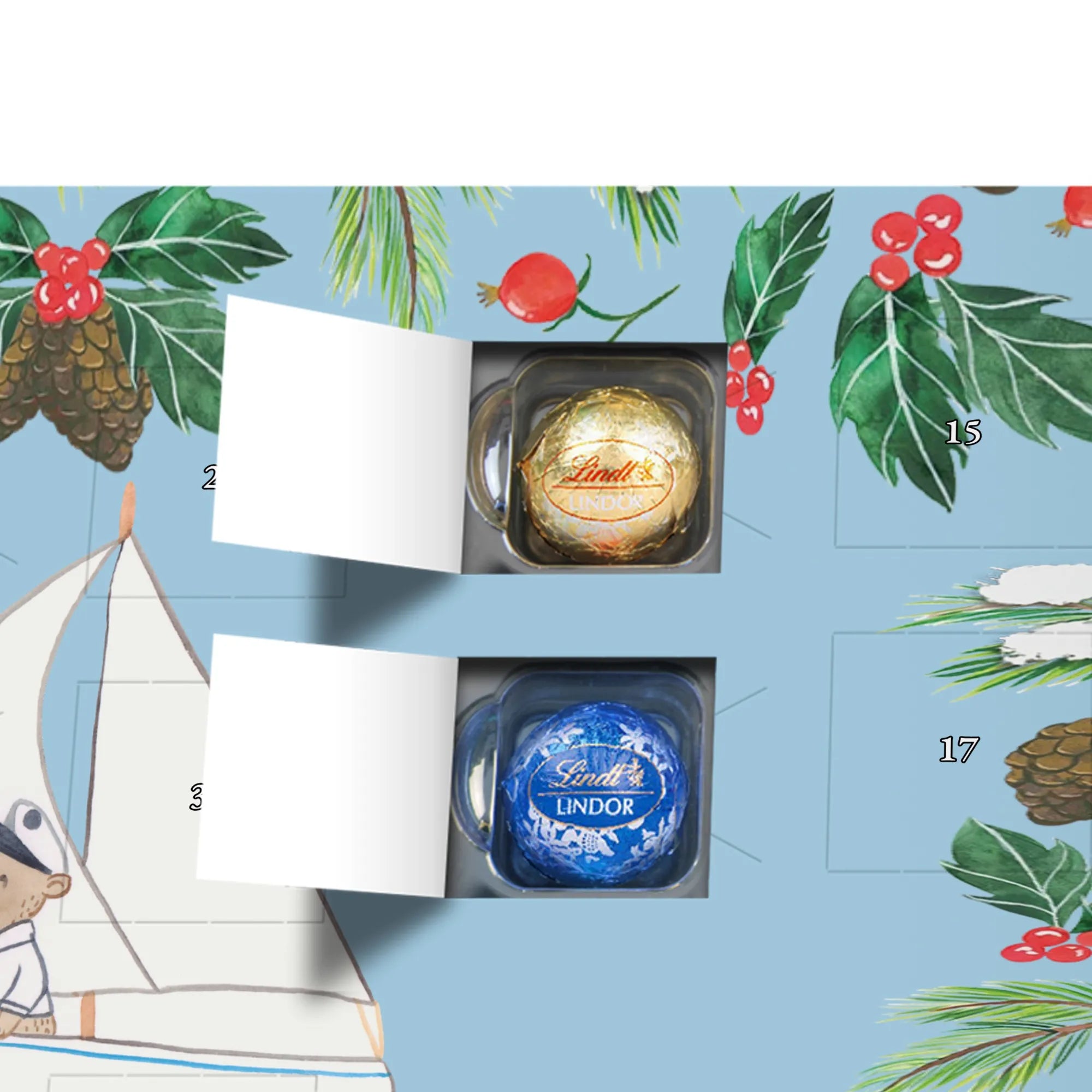 Personalisierter Schoko Adventskalender Bär Segeln - Lindt LINDOR - Eisblau