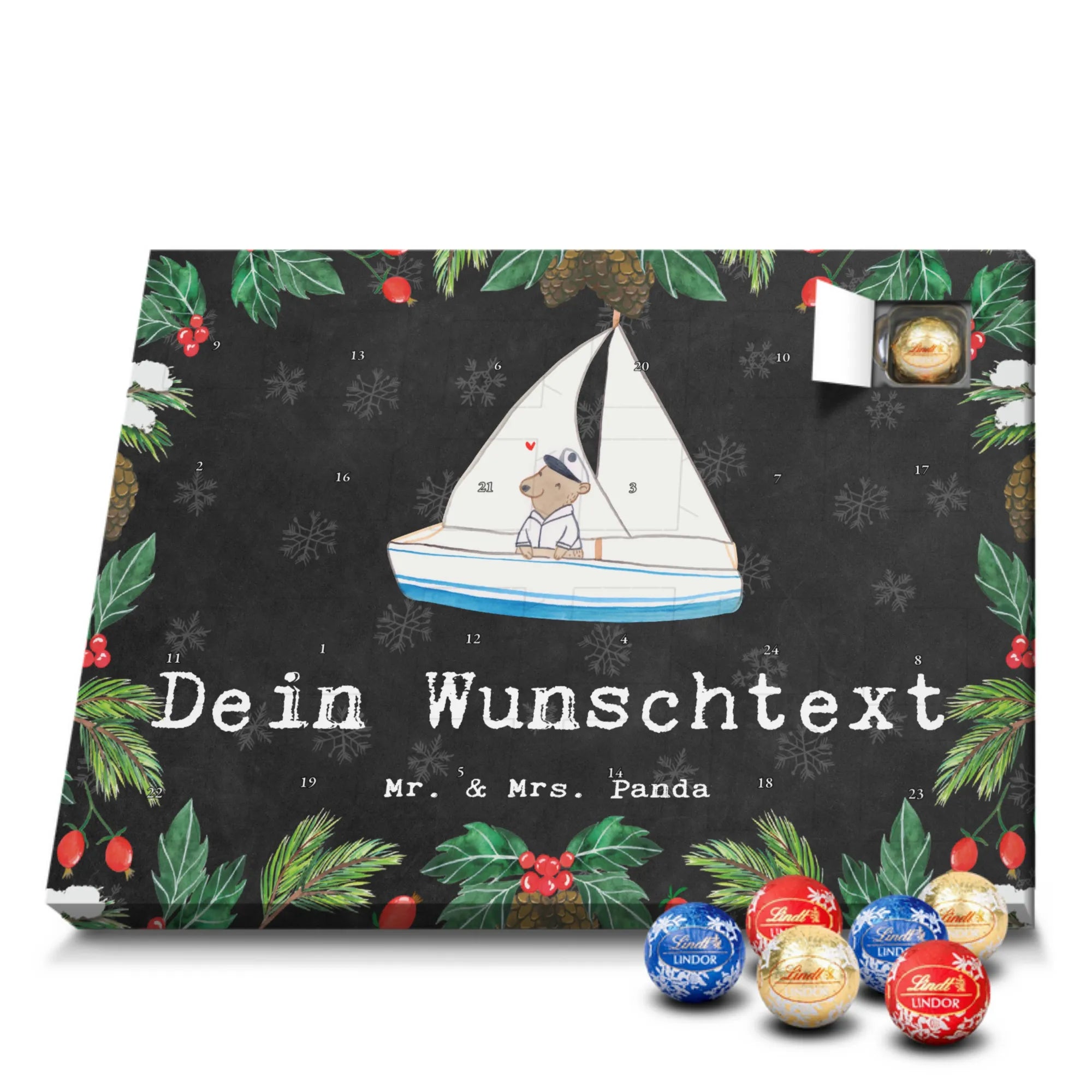 Personalisierter Schoko Adventskalender von Mr. & Mrs. Panda – der süße Countdown für dich oder deine Liebsten! Unser liebevoll gestalteter Adventskalender ist bedruckt mit wunderschönen Motiven und fröhlichen Sprüchen von Mr. & Mrs. Panda und lässt sich mit deinem Wunschnamen oder Wunschtext personalisieren. Die brillante Druckqualität kombiniert mit einer seidenmatten Oberflächenveredelung sorgt für ein edles Finish, zusätzlich sind die Seitenflächen bedruckt für ein durchgängiges Design. Maße: 233 mm x 178 mm x 24 mm. Der Kalender ist besonders praktisch: du kannst ihn entweder aufstellen oder an der Wand aufhängen – so passt er überall hin und verbreitet vorweihnachtliche Stimmung. Gefüllt mit Lindt Lindor Schokolade: 24 einzeln verpackte Markenschokoladen Kugeln in drei verschiedenen Sorten. Geschmacksrichtungen: Vollmilch, Feinherb und Weiße Schokolade. Zutaten: Zucker, pflanzliches Fett (Kokosnuss, Palmkern), Kakaobutter, Vollmilchpulver, Kakaomasse, Milchzucker, Magermilchpulver, Butterreinfett, Emulgator (Sojalecithin), Gerstenmalzextrakt, Aromen. Besondere Hinweise: Kann Haselnüsse und Mandeln enthalten. Dieser Adventskalender ist das perfekte Geschenk für Familien, Paare, Freunde oder für dich selbst – ein kleines tägliches Verwöhnmoment im Dezember. Bestell jetzt deinen personalisierten Schoko Adventskalender und zaubere ein Lächeln unter den Tannenbaum!