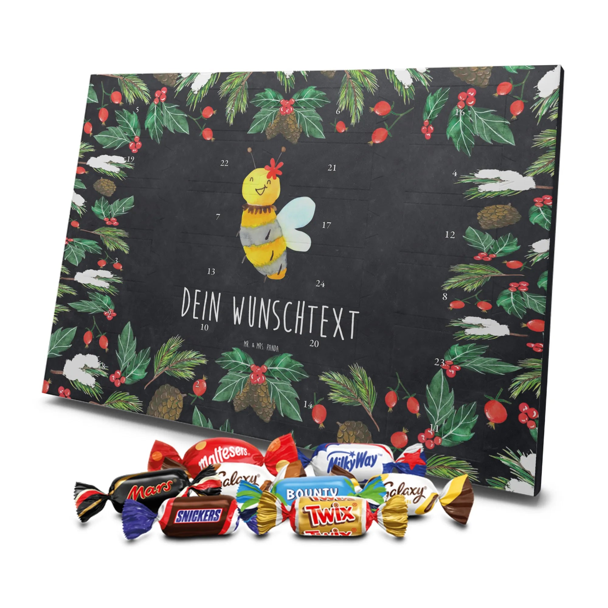 Schoko Adventskalender personalisiert von Mr. & Mrs. Panda – eine besonders liebevolle Geschenkidee für die Adventszeit. Unser Design vereint niedliche Illustrationen und herzliche Sprüche, die wir selbstverständlich mit deinem Wunschtext oder Namen personalisieren. Die brillante Druckqualität wird durch eine seidenmatte Oberflächenveredelung unterstrichen, die Farben und Details wunderschön zur Geltung bringt. Zusätzlich sind die Seitenflächen bedruckt, sodass das Motiv rundum stimmig ist. Du kannst den Kalender entweder aufhängen oder aufstellen – je nachdem, wo die Vorfreude am besten zur Geltung kommt. Gefüllt ist der Kalender mit Celebrations: 24 hochwertige Füllungen in 8 leckeren Sorten wie Maltesers, Mars, Snickers, Twix, Milky Way, Bounty, Galaxy und Galaxy Caramel sorgen für abwechslungsreiche Genussmomente. Maße: 325 mm x 225 mm x 27 mm – ein handliches Format, das trotzdem viel Platz für süße Überraschungen bietet. Ob als Geschenk für Freunde, Familie oder als kleine Verwöhnung für dich selbst: Dieser personalisierte Schoko Adventskalender bringt täglich Freude und ist mit ganz viel Herz gestaltet.