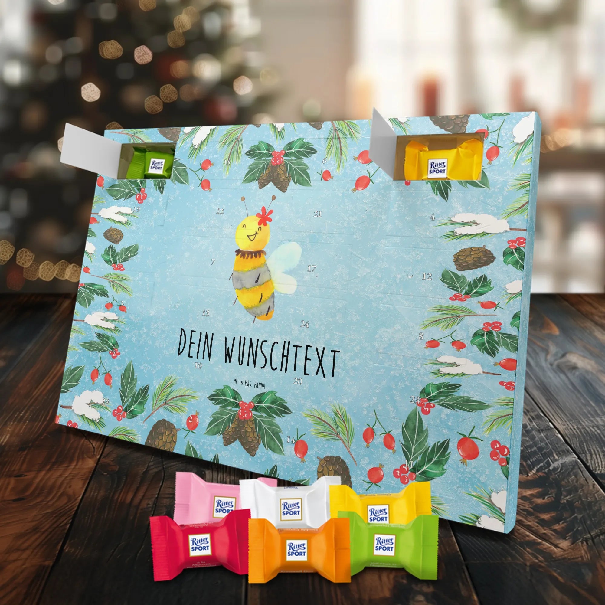 Suchst du einen besonderen Adventskalender, der persönlich und hochwertig ist? Unser Adventskalender mit Namen von Mr. & Mrs. Panda ist genau das – individualisierbar mit dem Namen deiner Liebsten oder einem kurzen Spruch und bedruckt mit unseren beliebten, charmanten Motiven. Die Druckqualität ist brillant, die seidenmatte Oberflächenveredelung verleiht dem Kalender eine elegante Haptik. Auch die Seitenflächen sind liebevoll bedruckt, sodass das Design rundum überzeugt. Du kannst den Kalender aufstellen oder an einer Stelle aufhängen, die du magst – die besondere Form macht beides möglich. Gefüllt ist der Kalender mit Ritter Sport Schokowürfeln in sechs beliebten Sorten: Mousse au Chocolat, Schoko Crisp, Voll-Nuss in Nougatcreme, Karamell Duo, Joghurt und Erdbeer-Joghurt. So gibt es hinter jedem Türchen eine kleine, leckere Überraschung. Maße: 325 mm x 225 mm x 27 mm – kompakt genug, um überall Platz zu finden, groß genug für 24 sorgfältig verpackte Schokowürfel.