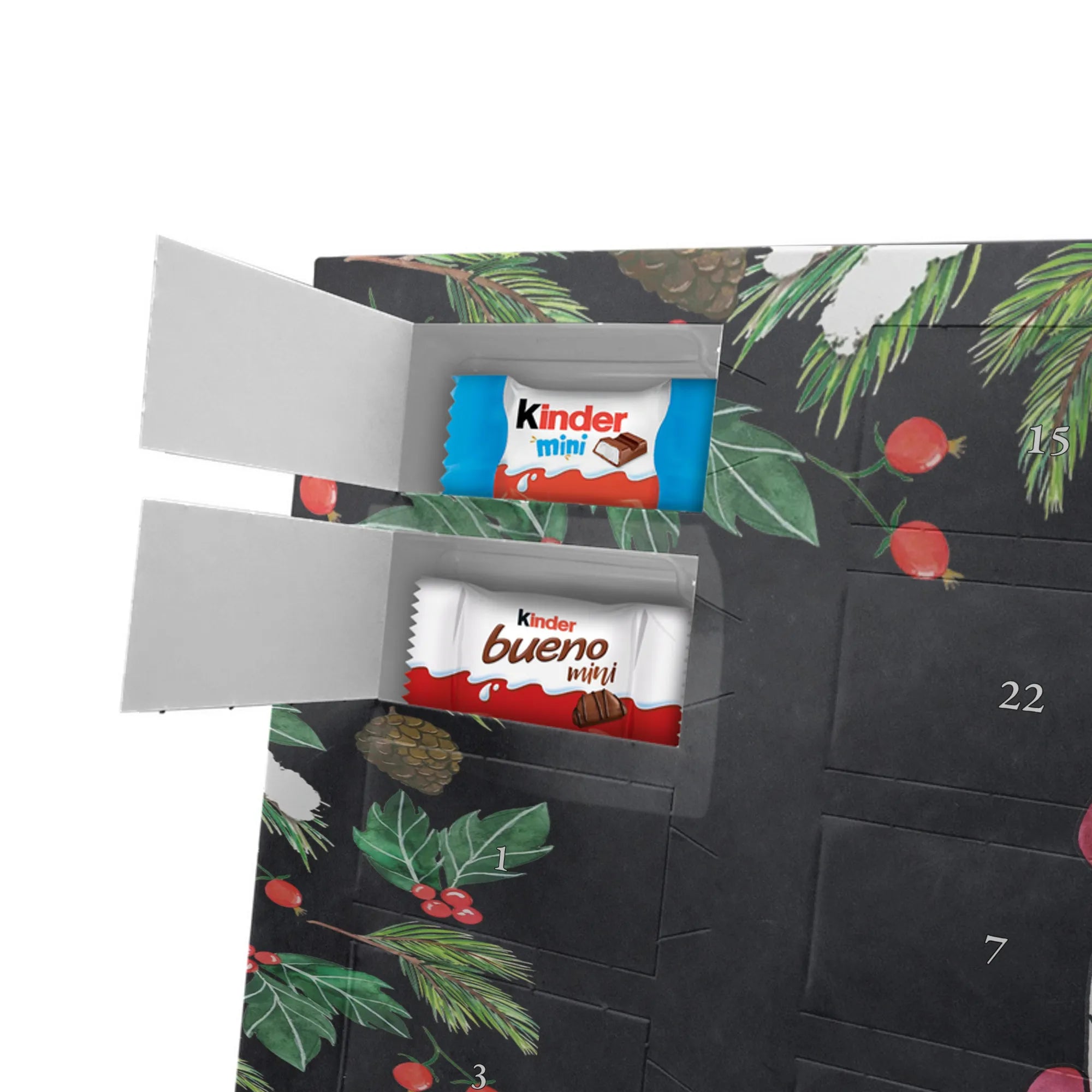 Gefüllt mit kinder® Schokolade: Der Kalender enthält eine leckere Mischung aus kinder® Schoko-Bons, kinder® Bueno mini und kinder® Schokolade mini – für jeden Adventstag eine süße Überraschung.